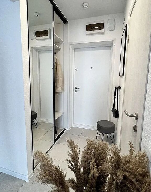 В прихожей встроенный шкаф-купе, выполненный на заказ, с большим количеством мест для хранения одежды и хозяйственных принадлежностей.