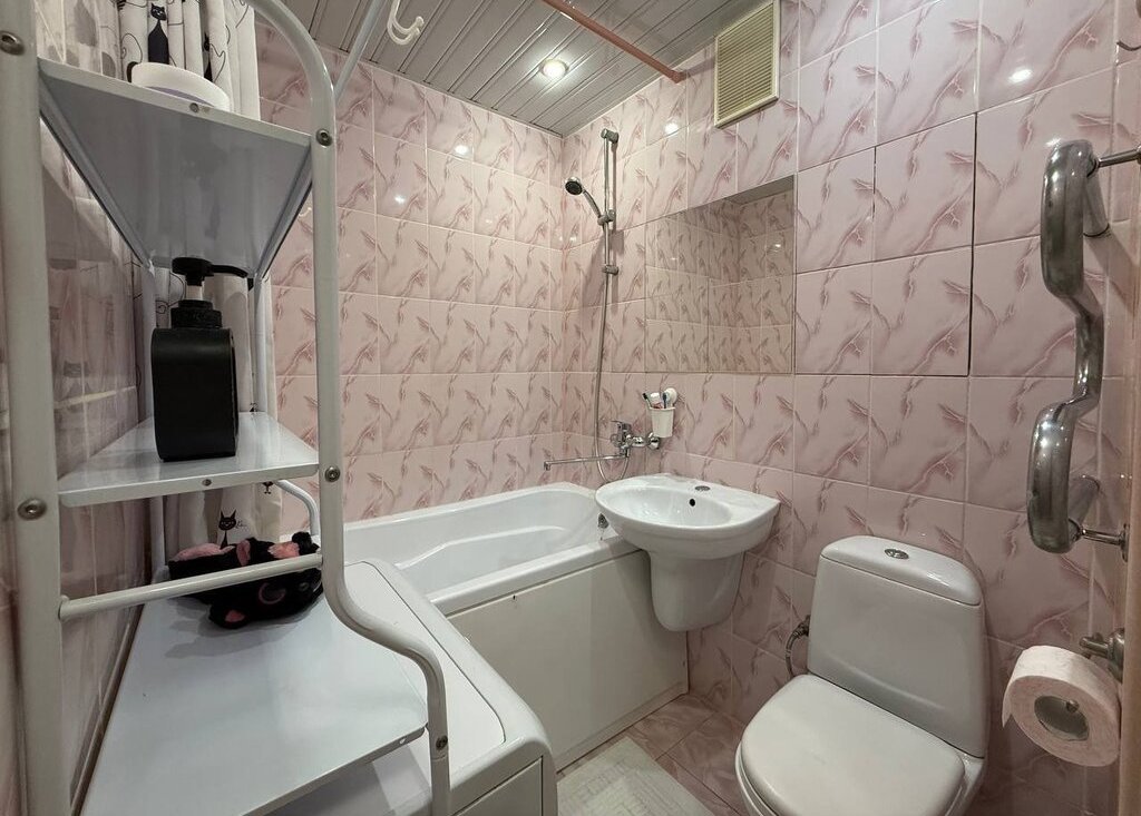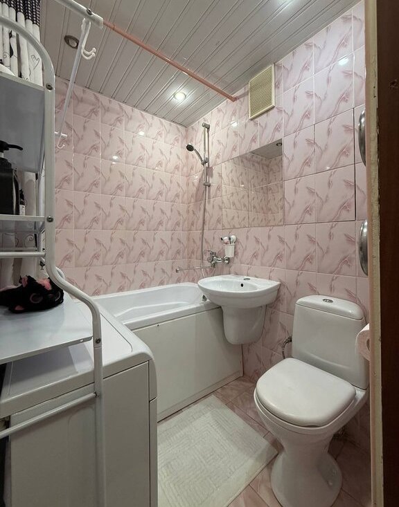 Ванная комната: ванна, функциональная полка для личных вещей, стиральная машина.