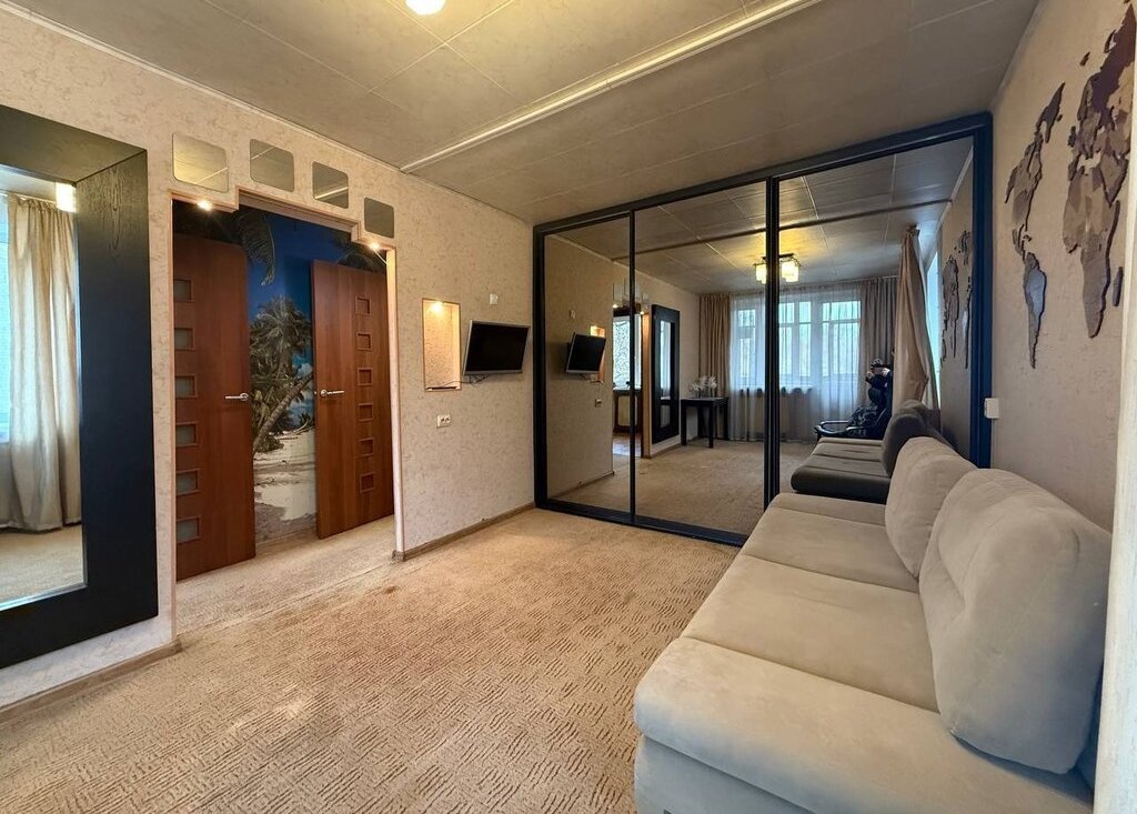 Комната: раскладной диван, телевизор, роутер (WiFi), очень вместительный и просторный шкаф-купе, стол, большое, во весь рост зеркало, комод, кресло и просторный балкон с местами для хранения.