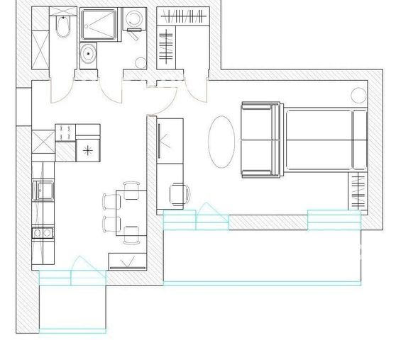 В квартире гостиная с выделенной спальной зоной (20 м2) и огромной лоджией (7 м2), отдельная кухня (10 м2) с своим балконом. Имеется выделенная гардеробная, раздельный с/узел.