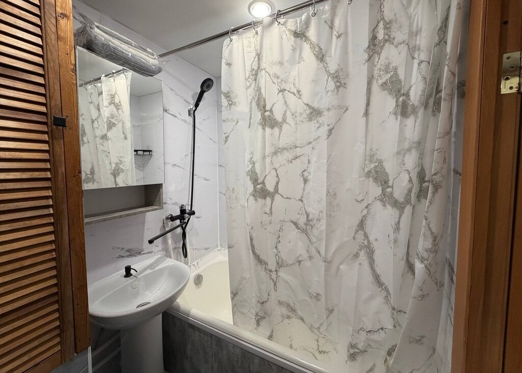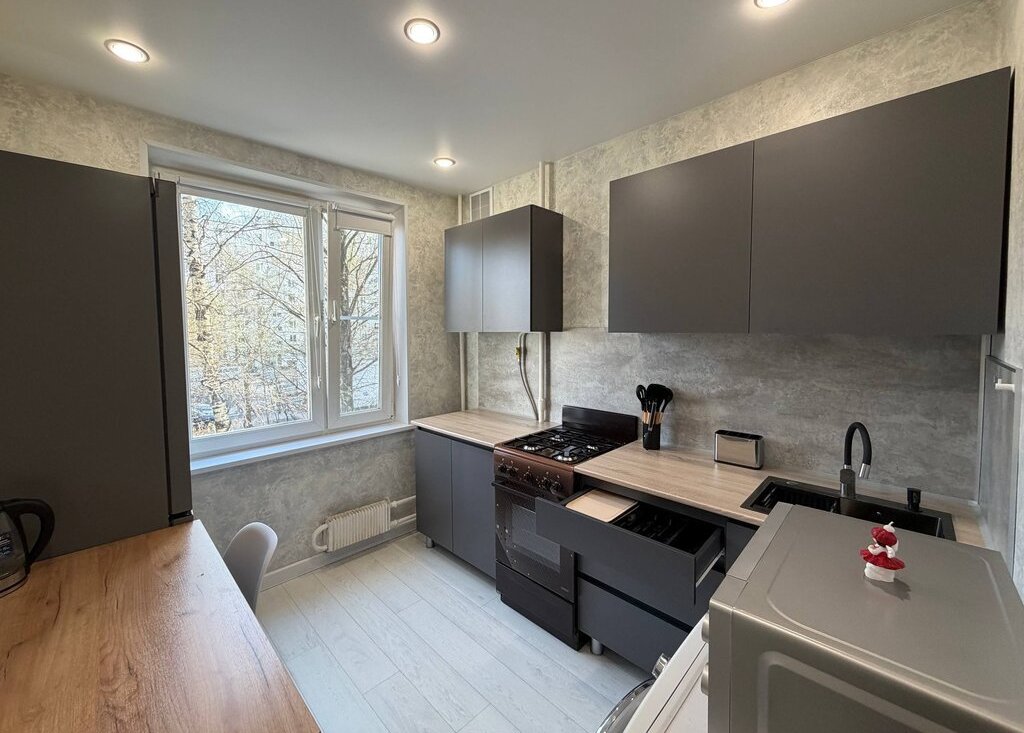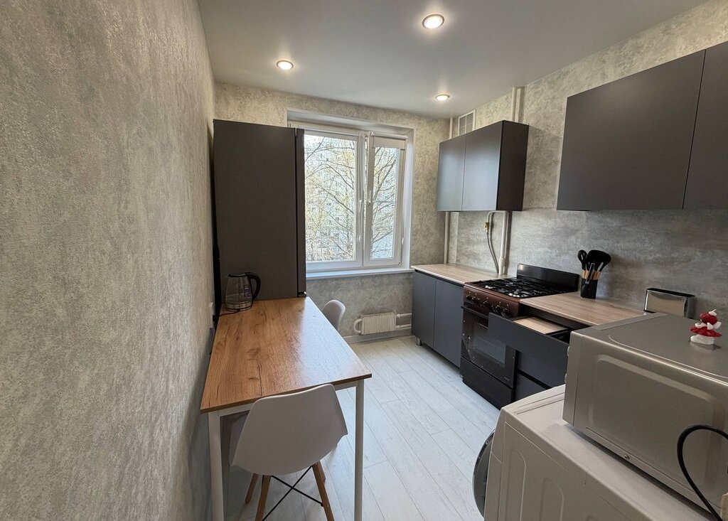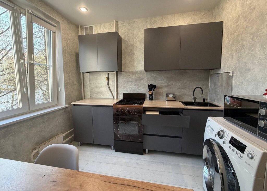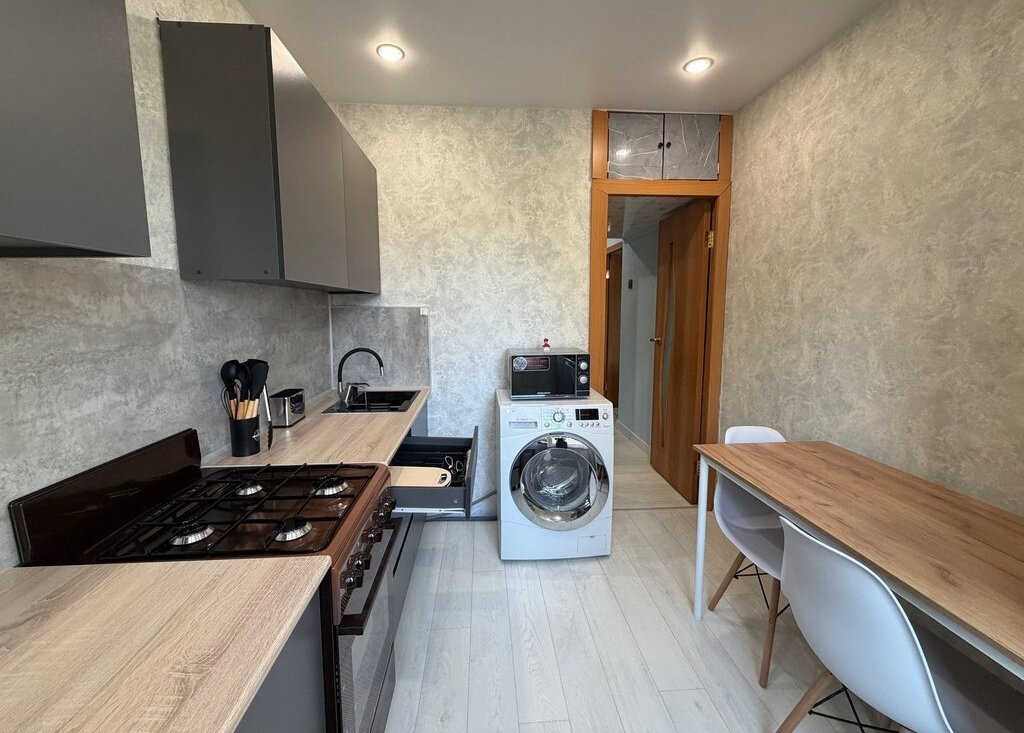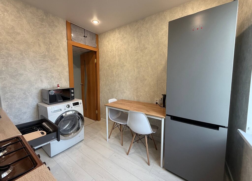Квартира полностью готова к комфортному проживанию: есть вся необходимая мебель и техника — стиральная машина, холодильник, телевизор, микроволновая печь, чайник, отпариватель и пылесос.