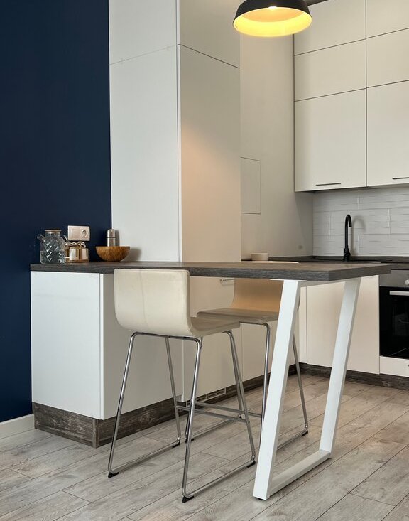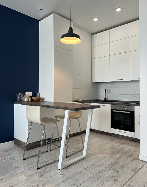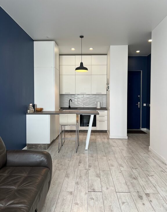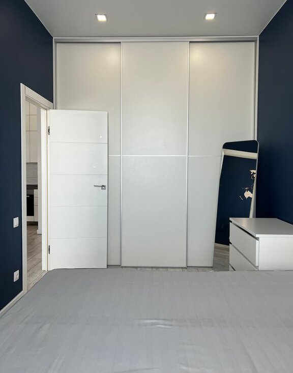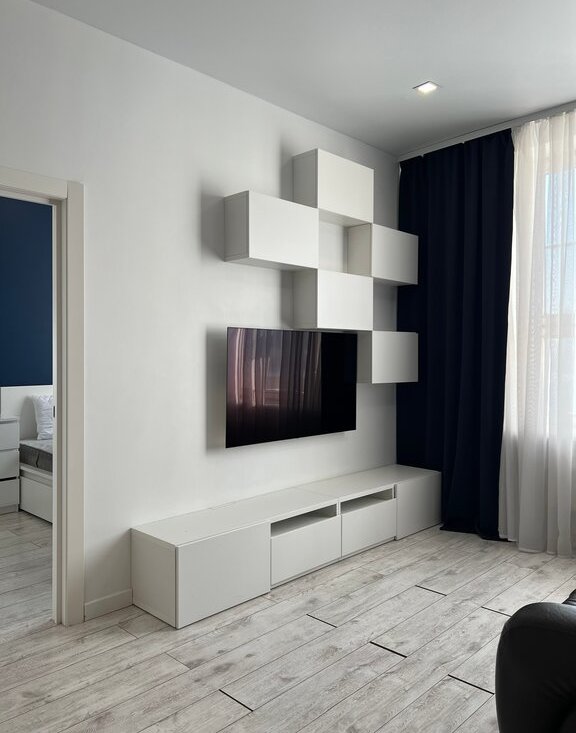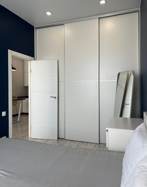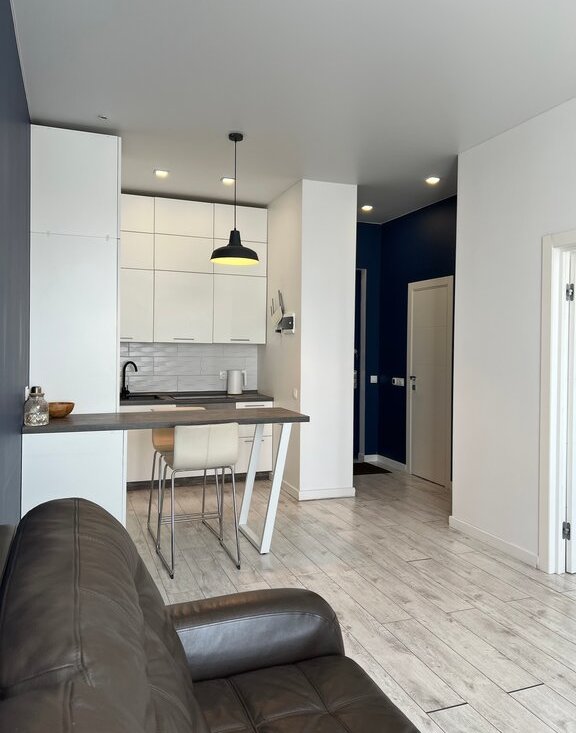 Встроенная кухня с барной стойкой. Спальня с кроватью 2х1.6 м2, в гостиной диван тоже раскладывается. Вместительный шкаф-купе.
