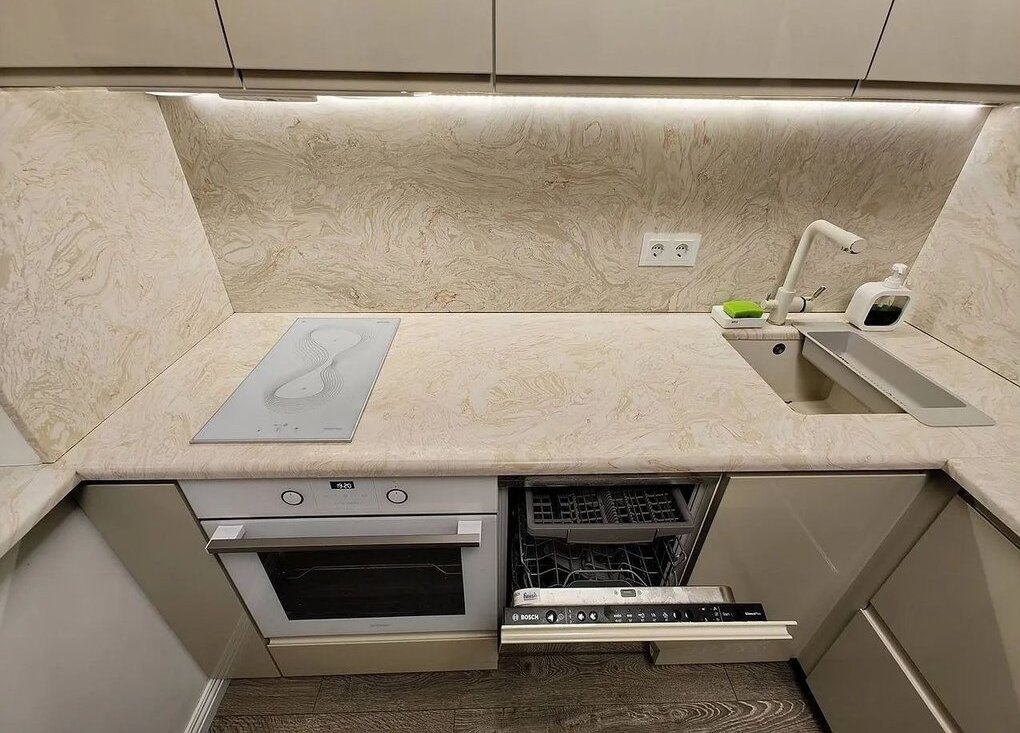 Трёхуровневая кухня с большим объемом хранения, встроенный холодильник и посудомойка Воsсh, индукционная варка и духовой шкаф Gоrеnjе дизайнерская серия Каrim Rаshid. Столешница переходящая в подоконник и фартук из искусственного мрамора.