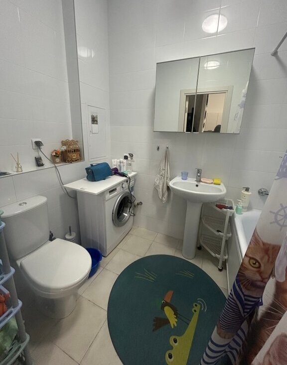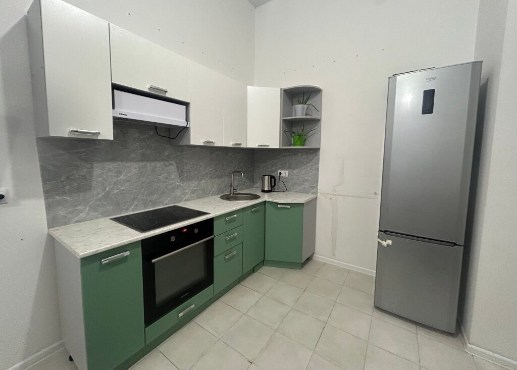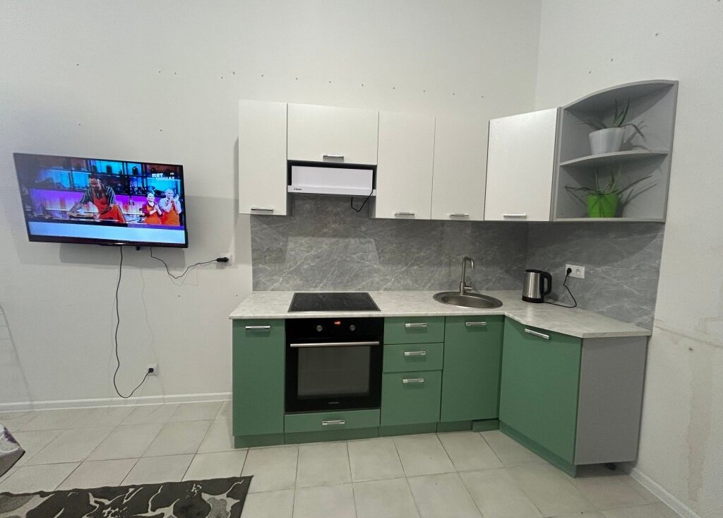 Просторная кухня-гостиная ( 18 кв.м) и спальня - 14 кв.м. Высокие потолки, 4 метра, в квартире легко дышится. Вся необходимая мебель и техника имеется, есть духовка, варочная панель, посудомоечная машина, холодильник, микроволновка, телевизор, кондиционер. В кухн-гостиной раскладной диван, в спальне двухспальная кровать и вместительный шкаф. Сан узел совместный. Стиралка есть, ванна. Люстры будут установлены сегодня.