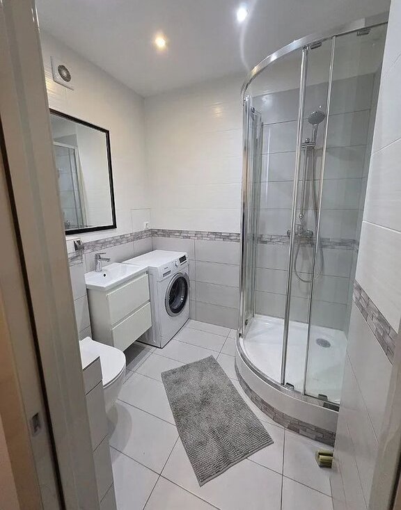 В санузле душевая кабина , тумба с раковиной, стиральная машина, туалет .