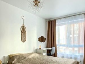 В спальне большая кровать 180х200 с ортопедическим матрасом, вместительный функциональный шкаф. Шторы блэкаут. Кондиционер Hyundai. На фото нет, но уже заказан телевизор 50 дюймов со Smart tv