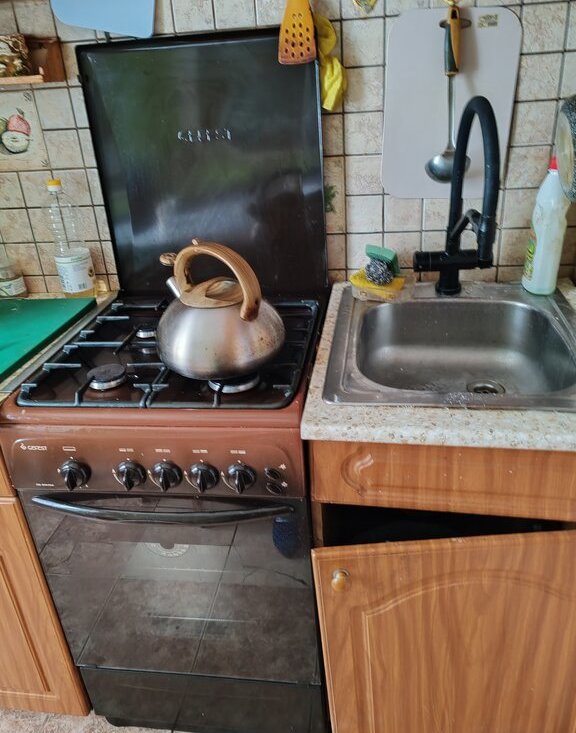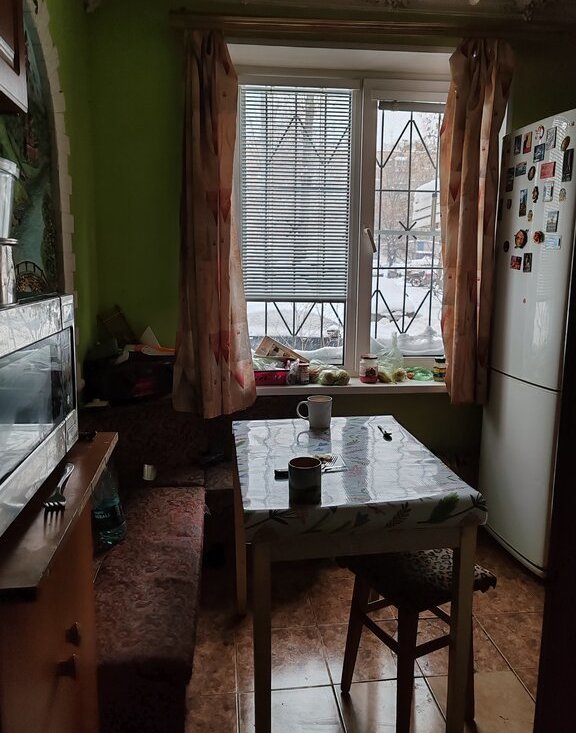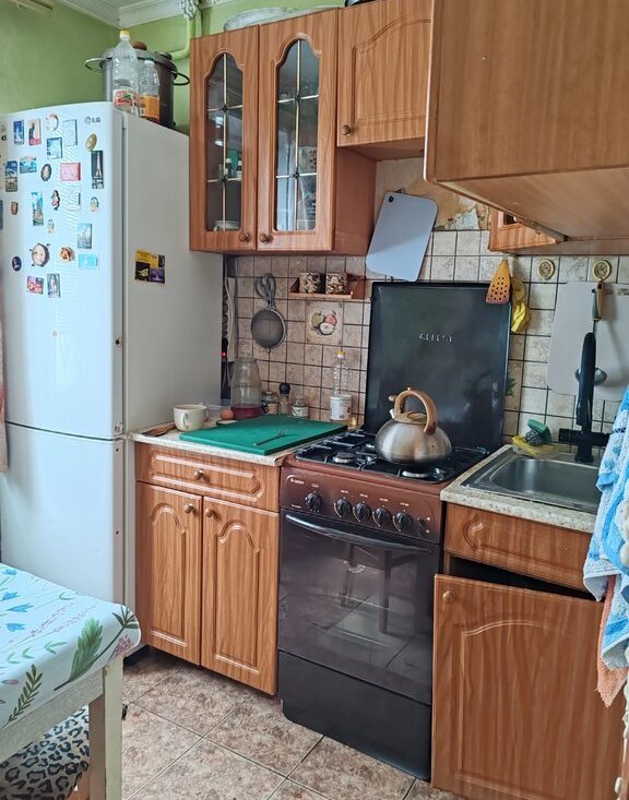 Кухня 6 м²: есть стол, холодильник, предоставляются сковорода, кастрюля.