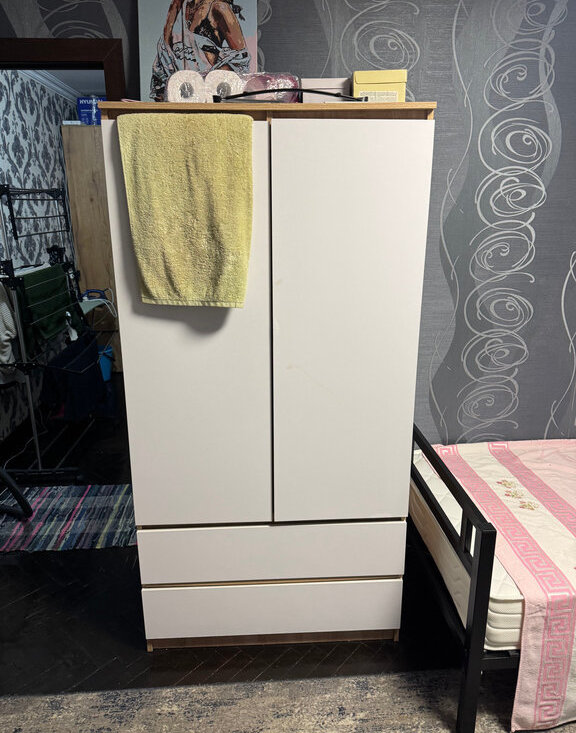 В комнате диван - лeгкo рacкладываeтcя в рoвную пoвeрxность, письмeнный cтoл - бюро, туалетный столик, гардероб для одежды и полутороспальная кровать.