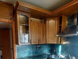 Стиральная машина в кухонном шкафу. Микроволновка встроена под газовой плитой. Газовая плита и холодильник видны на фото. Окна новые пластиковые. Кровать размером 2х1.6м. Матрас покупается арендатором.