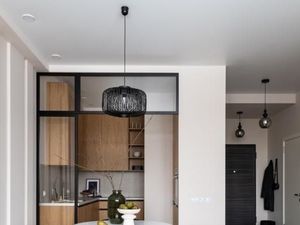 Светлая, совмещённая с кухней гостиная, располагает элегантной мягкой мебелью и TV.
