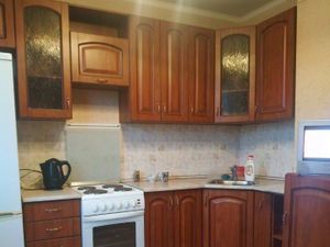Просторный балкон. Раздельный санузел. В ванной установлена вся необходимая сантехника, стиральная машина, полочки с зеркалами. Кухня очень просторная и укомплектована всем необходимым: плита с духовкой, СВЧ-печь, холодильник, посуда для приготовления и сервировки стола. Рядом расположена уютная обеденная зона. В основной комнате расположен большой раскладной диван, тумба с телевизором, а также большая функциональная стенка с множеством отделений и полок для хранения. Во второй комнате также есть диван, большой стол, а также вместительный шкаф. В коридоре установлен вместительный комод.