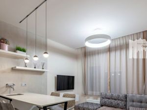 В квартире установлен кухонный гарнитур, кондиционер, кухня полностью оборудована техникой, квартира теплая, хорошая шумоизоляция.