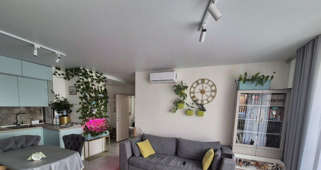 - **Мебель и техника:** полностью оборудована, остаётся при продаже (кухня со всей встроенной техникой, шкафы, диван, кровать, стиральная машина, холодильник, два кондиционера и др.).