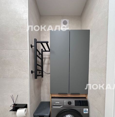 - стиральная машина, электрический полотенцесушитель, шкаф для хранения, большое зеркало, короб для белья