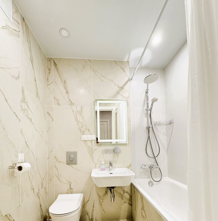 - Полный набор мебели и бытовой техники (холодильник, индукционная варочная поверхность, духовка, посудомоечная машина, вытяжка, чайник, телевизор, стиральная машина, кондиционер, пылесос, утюг);