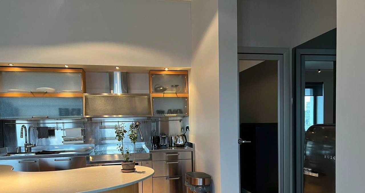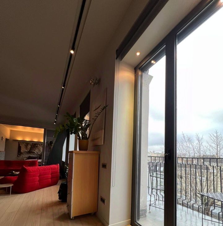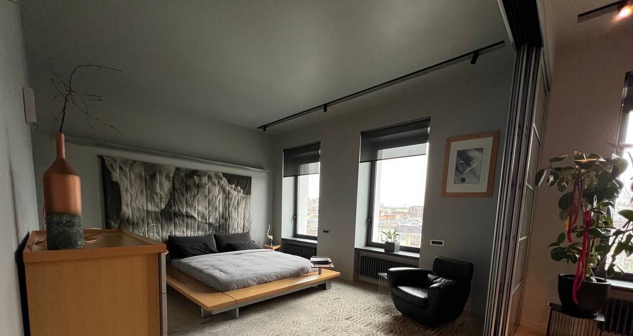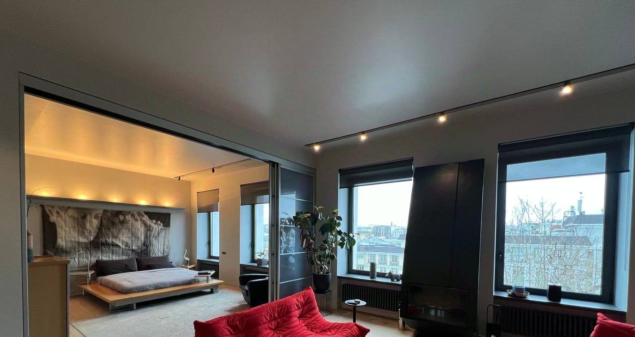 Квартира наполнена коллекционными предметами мебели от ligne Roset, кухня Arc Linea, сантехника Philip Stark. Высота потолка 3,30 м.