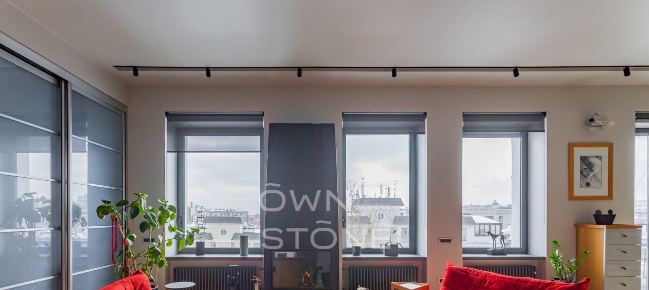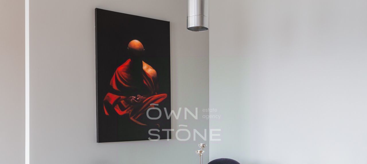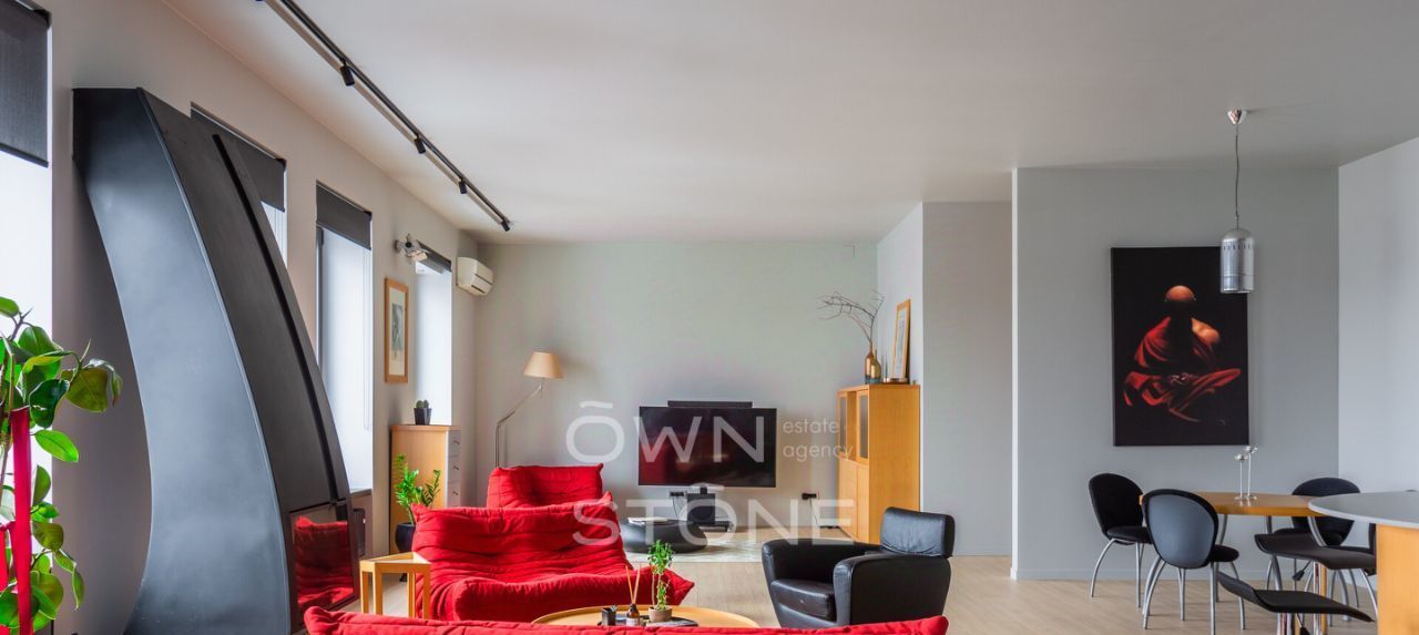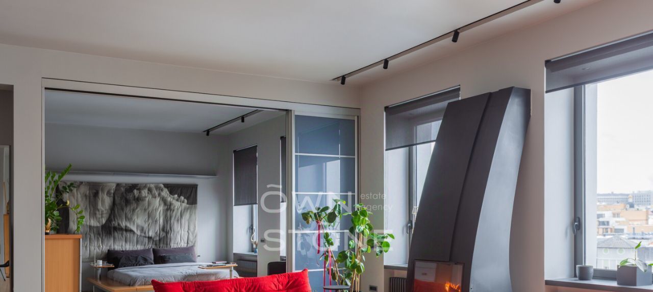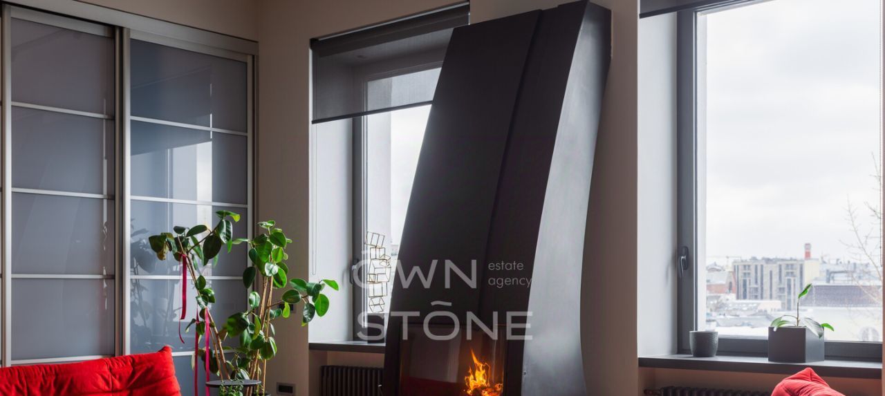 В гостиной — действующий дровяной камин, создающий неповторимую атмосферу уюта. Из окон открывается панорамный вид на Москву.