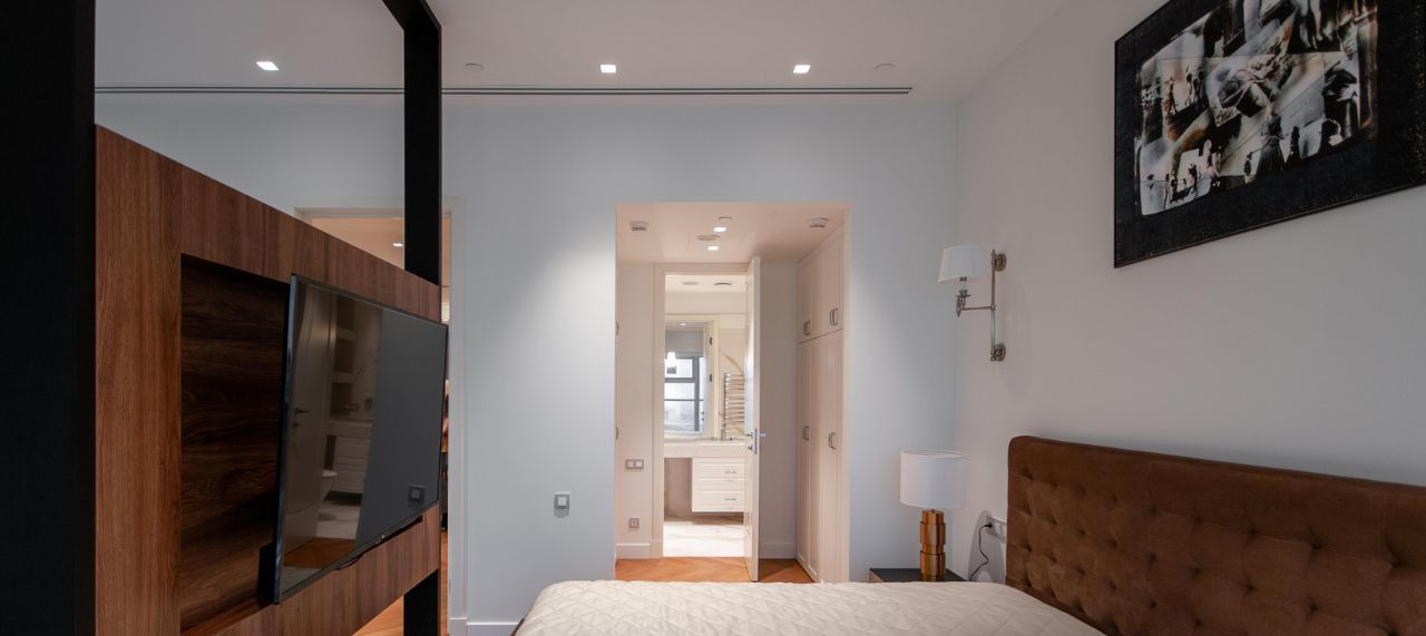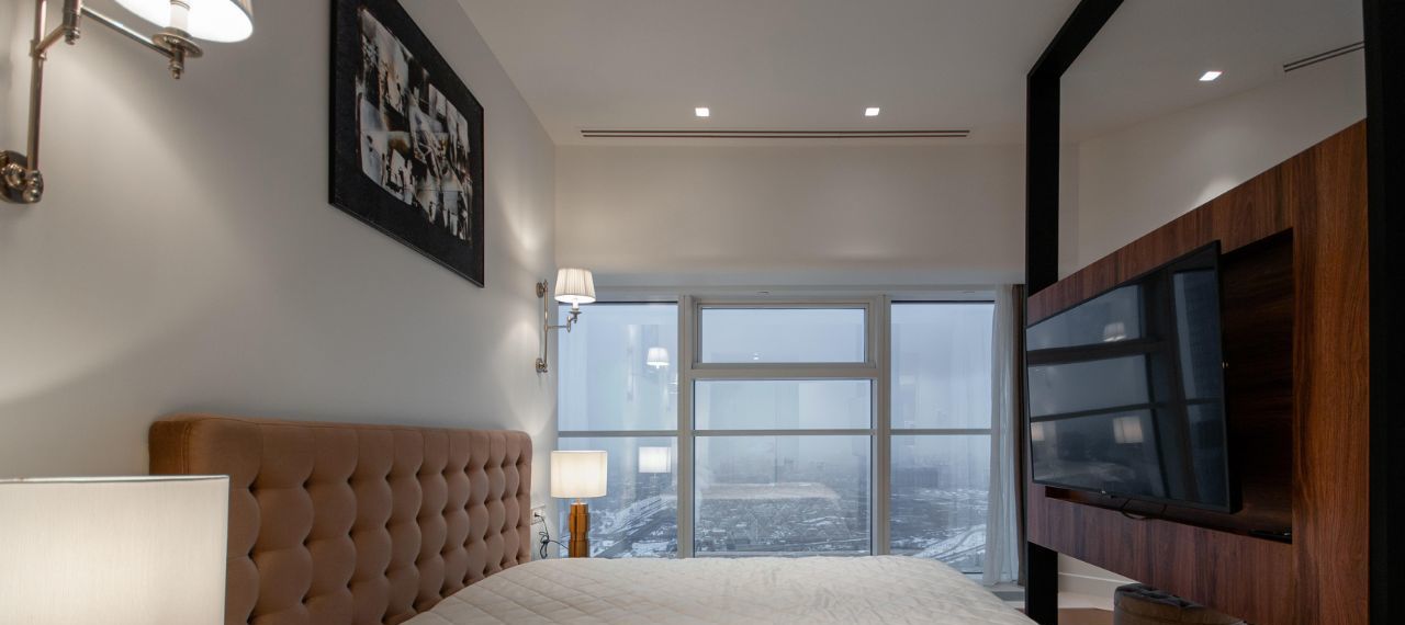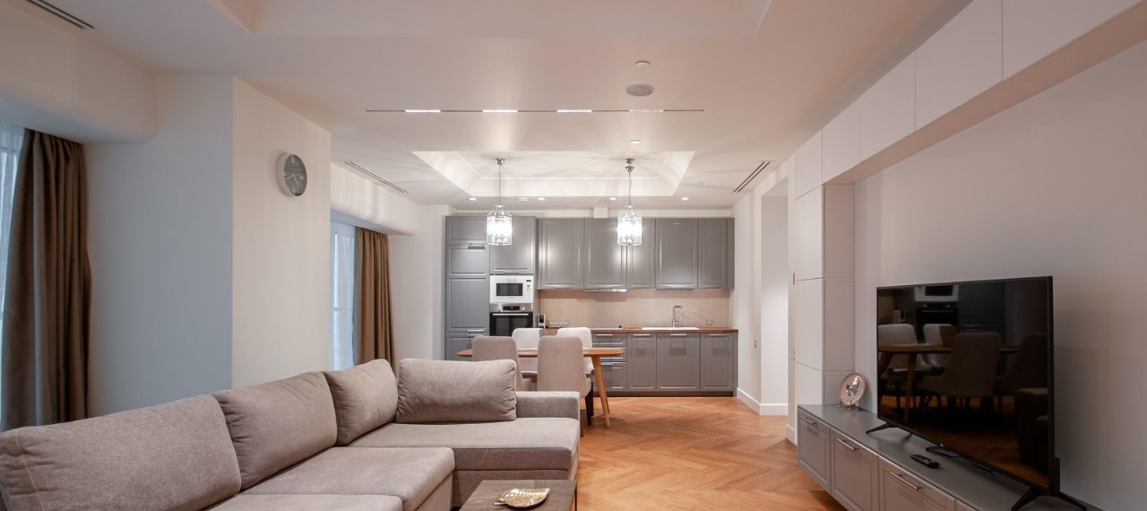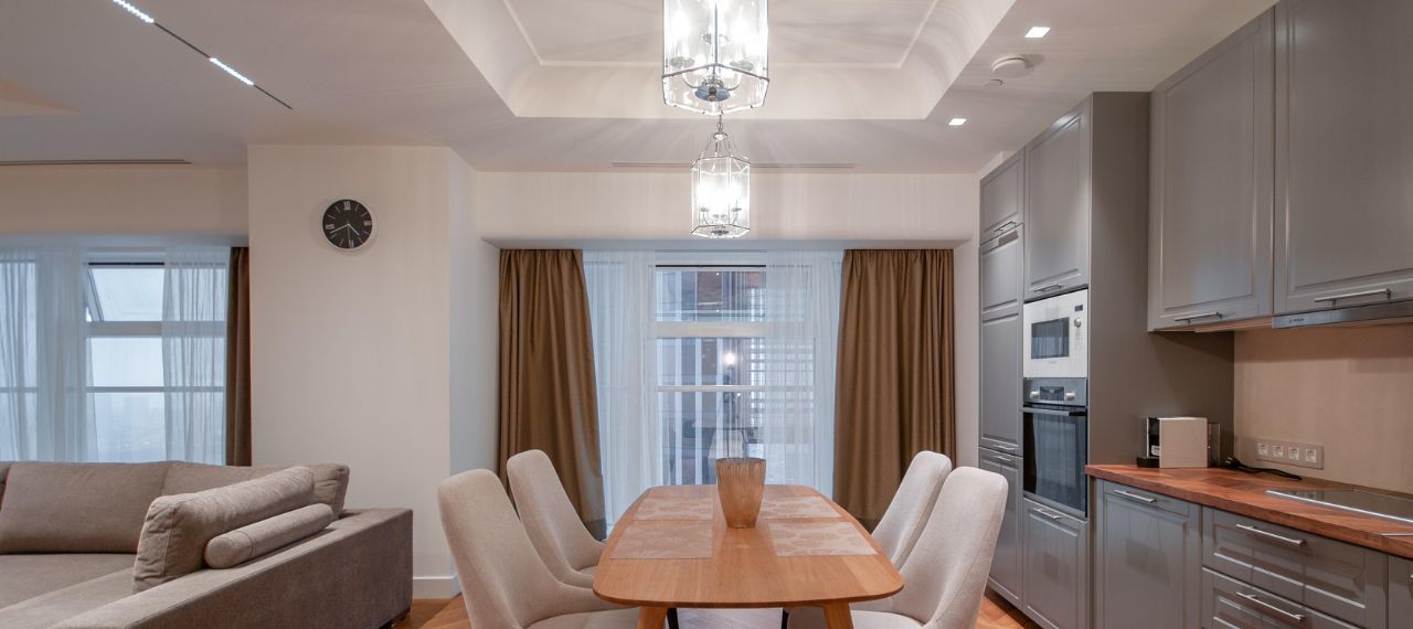Функциональные апартаменты с современной отделкой в стиле неоклассика, панорамным остеклением, полностью укомплектованы бытовой техникой и мебелью.