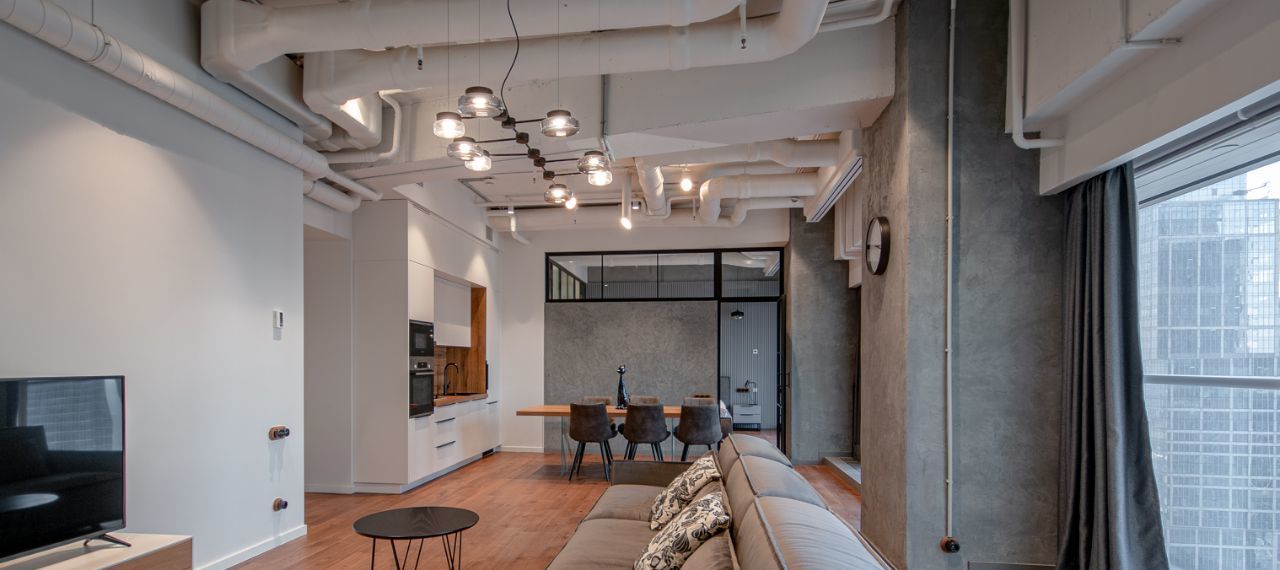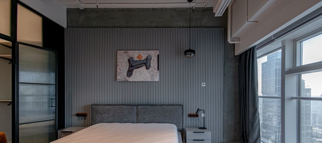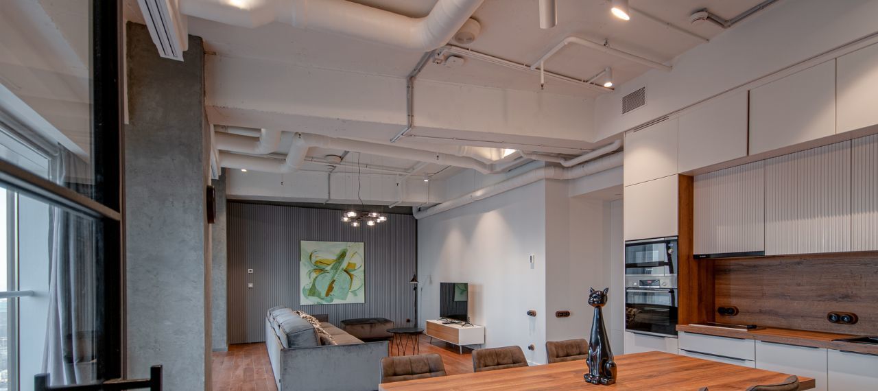 Функциональные апартаменты с современной отделкой в стиле лофт, панорамным остеклением, полностью укомплектованы бытовой техникой и мебелью.