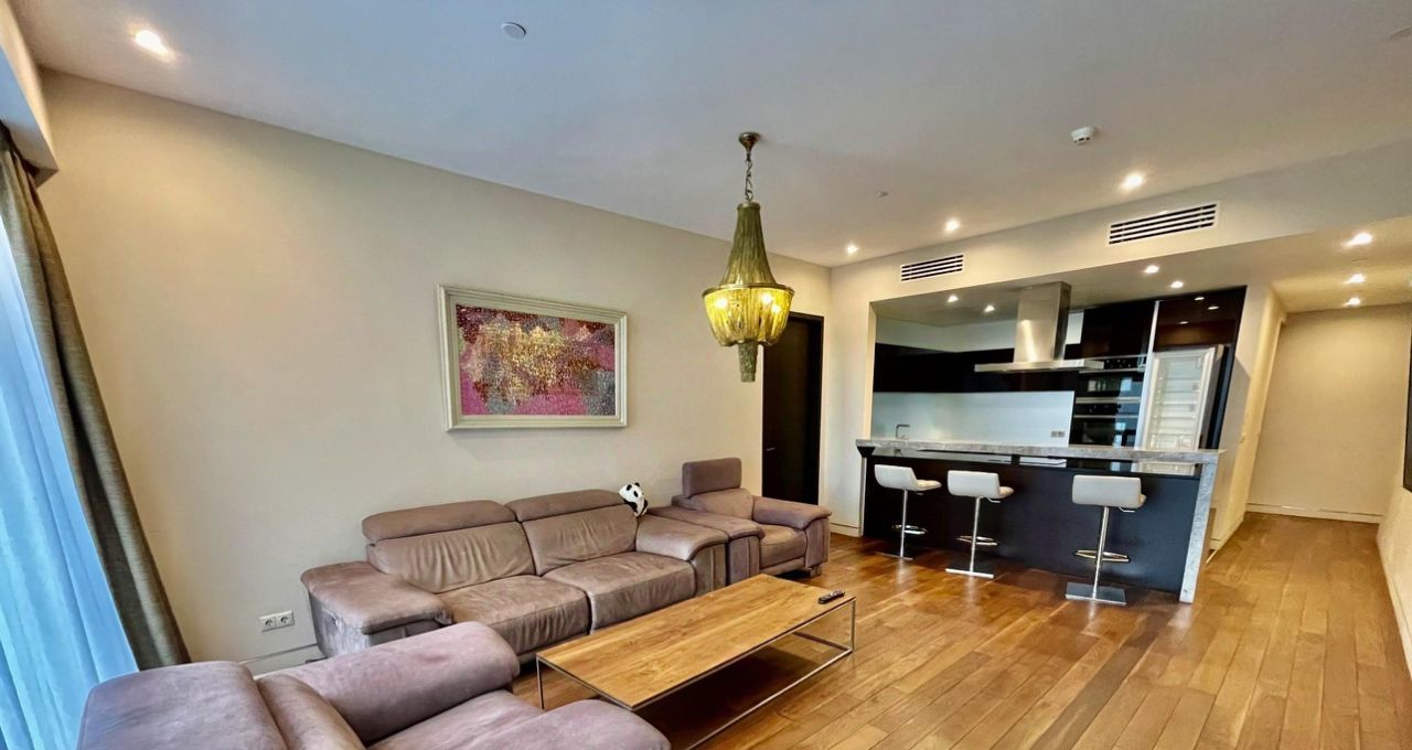 Апартамент состоит из: просторной кухни-гостиной, спальни, 2 санузлов, гардеробной, постирочной зоны.