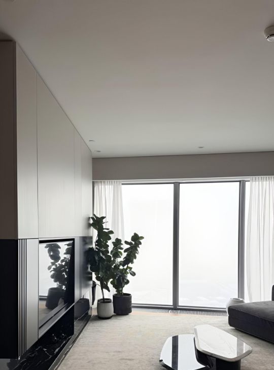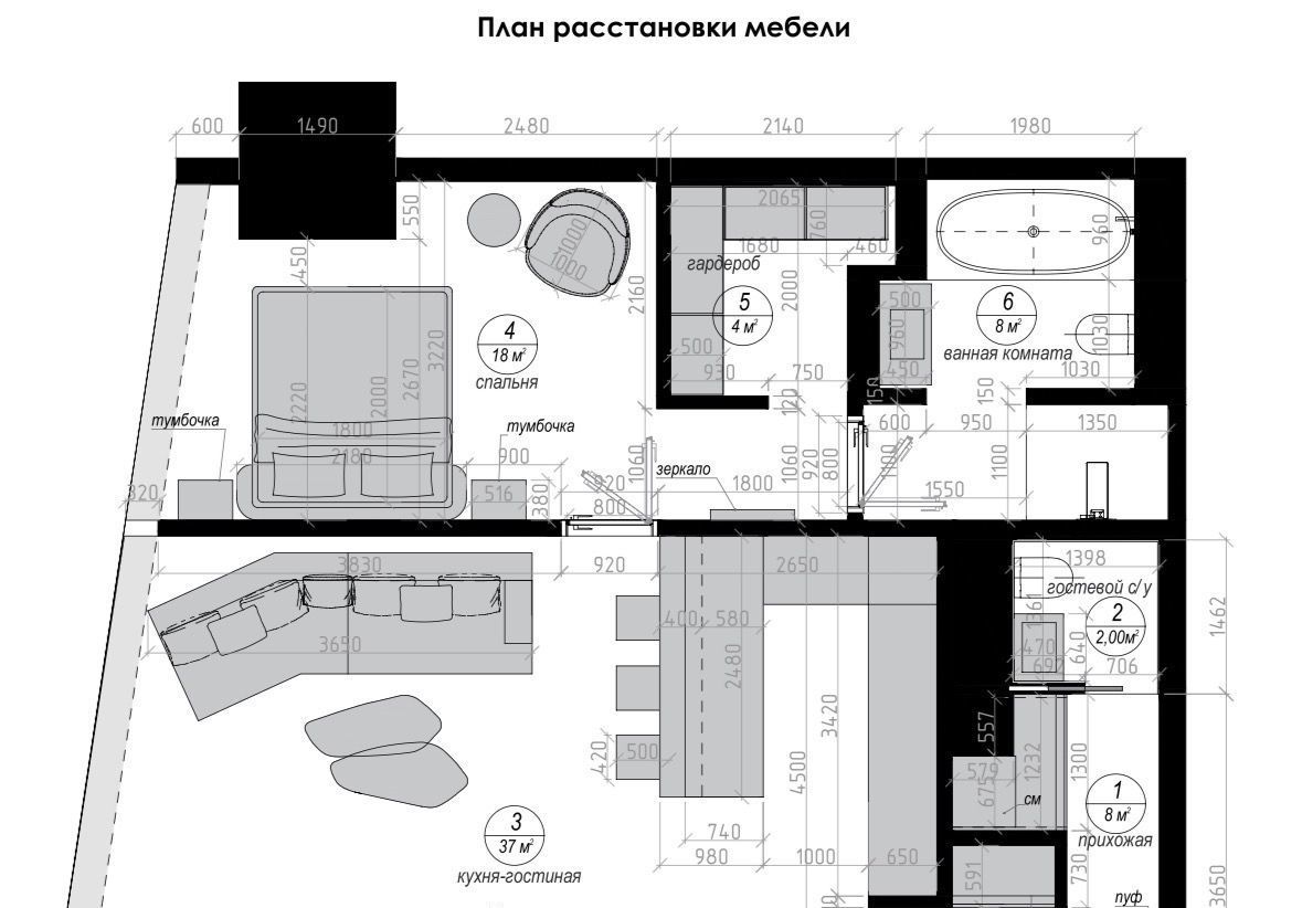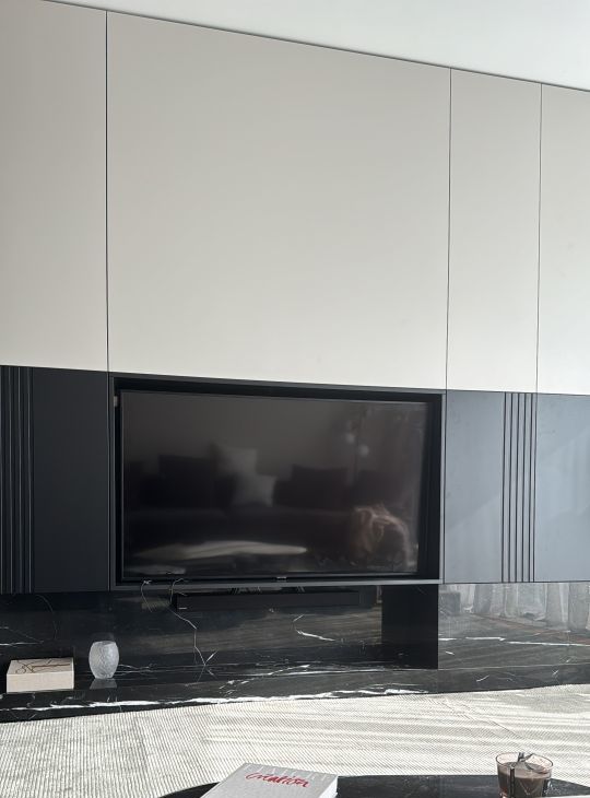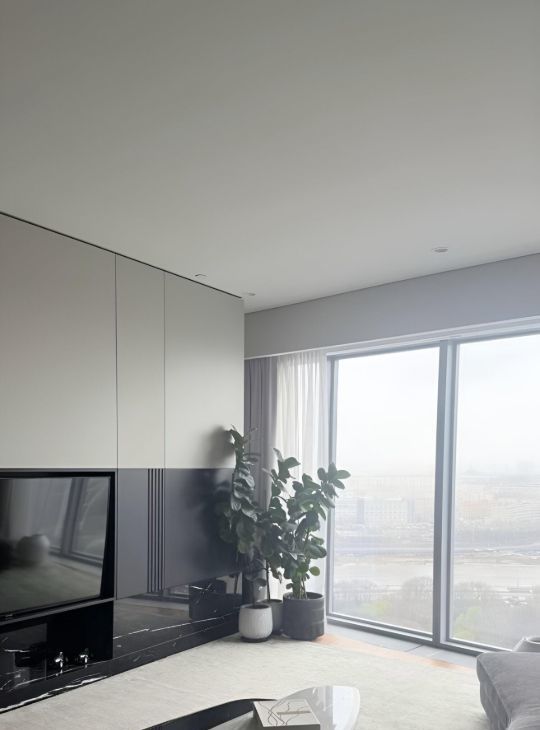 В гостиной комнате несущая колонна зашита в тв стенку. С дополнительной системой хранения.
