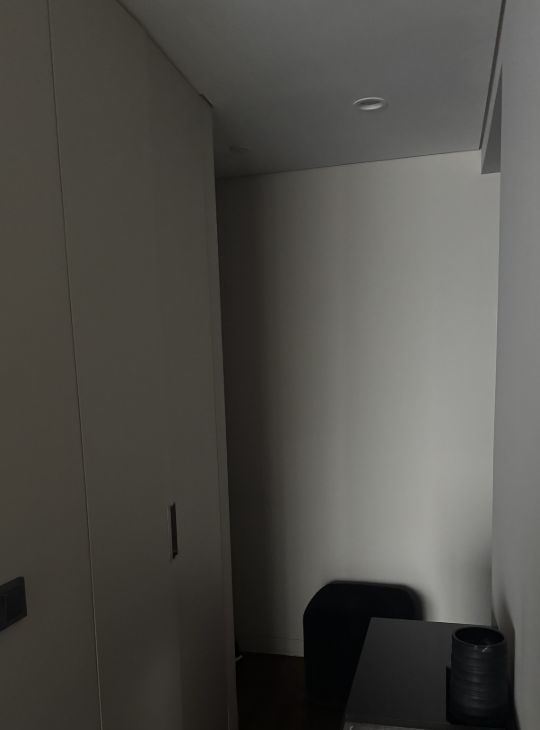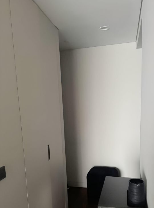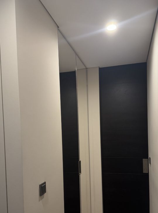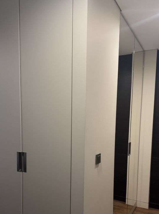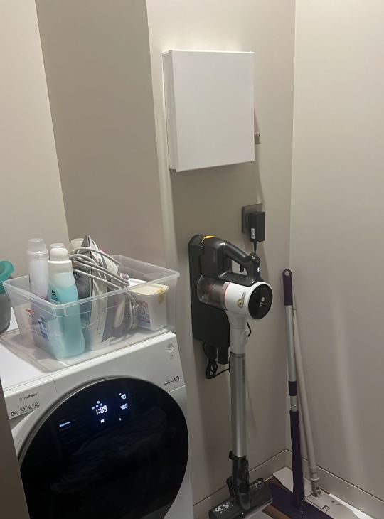 Грамотно организована постирочная зона в одном из шкафов. Включает в себя зону для размещения глубокой стиральной машины с функцией сушки, сушки для белья, место хранения и зарядки пылесоса. Хранение чемоданов.