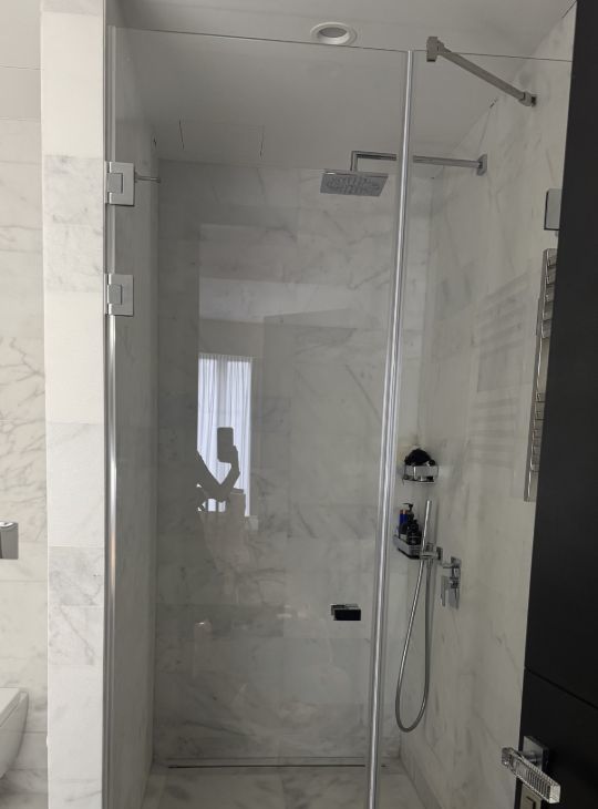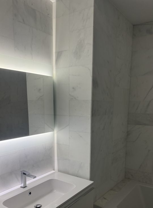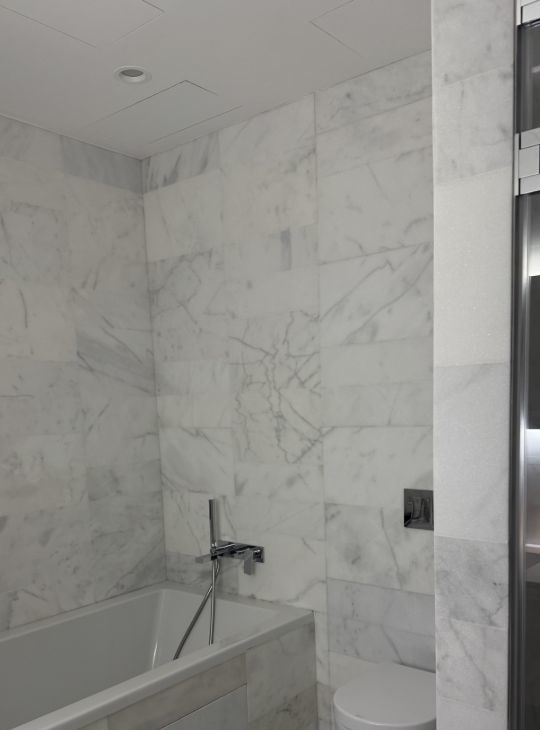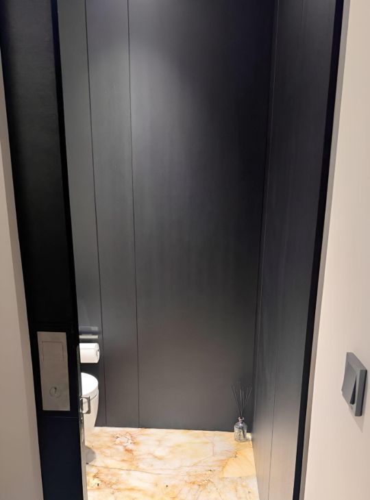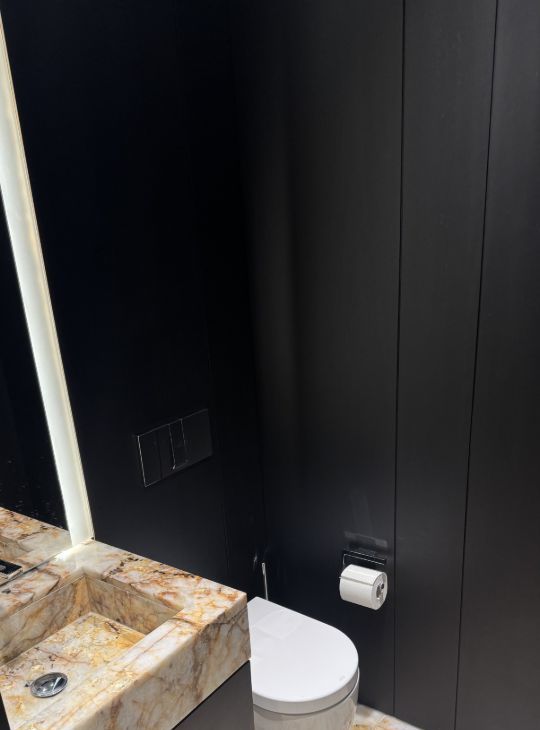 Гостевой санузел и ванная комната в натуральном камне и шпоне. В ванной комнате сделана после застройщика переполировка камня до отделки в коже.