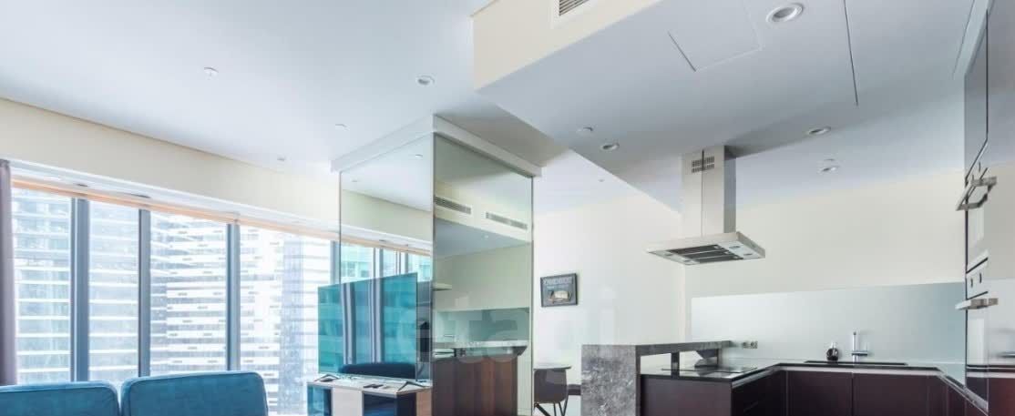 Планировка эффективно использует пространство: при входе организована функциональная прихожая со встроенным шкафом и гостевой санузел. Отдельная хозяйственная зона с прачечной повышает бытовой комфорт. Основное жилое пространство представляет собой объединенную гостиную-кухню, зонированную стеклянной конструкцией, что создает ощущение простора и света. Изолированная спальня оборудована собственной гардеробной и персональной санузлом. Ключевые инженерные решения включают центральное кондиционирование, приточно-вытяжную вентиляцию и панорамные окна с системой электроприводных штор, включая затемняющие модели "blackout".
