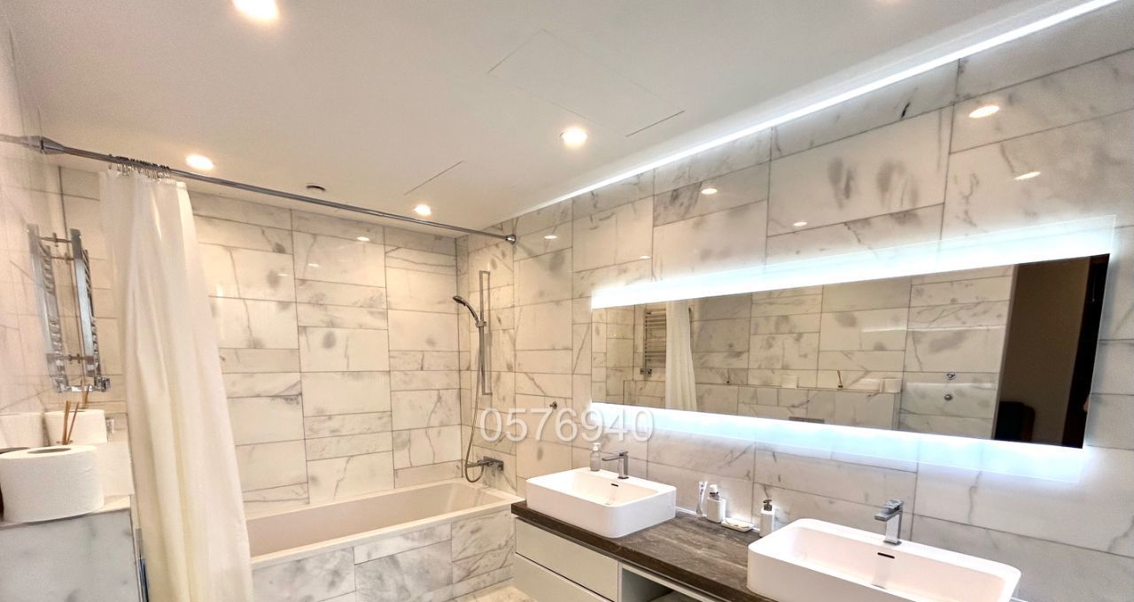 Квартира с дизайнерским ремонтом, полностью меблирована. Просторная кухня площадью 30 кв. м оснащена всей необходимой техникой: холодильником, посудомоечной машиной и кондиционером. В гостиной установлен телевизор, в ванной комнате есть ванна и стиральная машина. Мебель на кухне и в комнате позволяет сразу заселиться и наслаждаться комфортом.