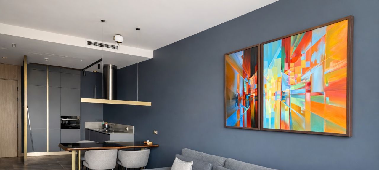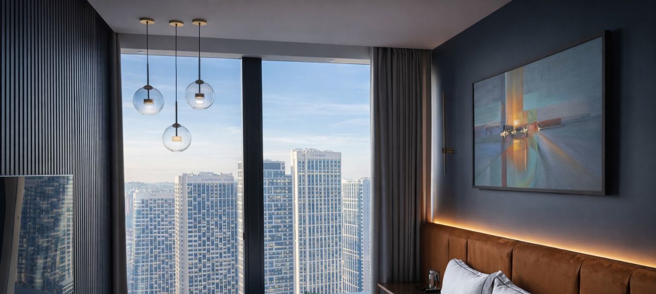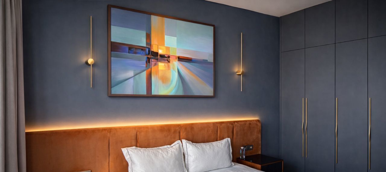 - Интерьер премиум-класса: Просторная спальня с изысканным дизайном. Мягкая спинка кровати, элегантные светильники и современное искусство создают атмосферу респектабельности и стиля.
