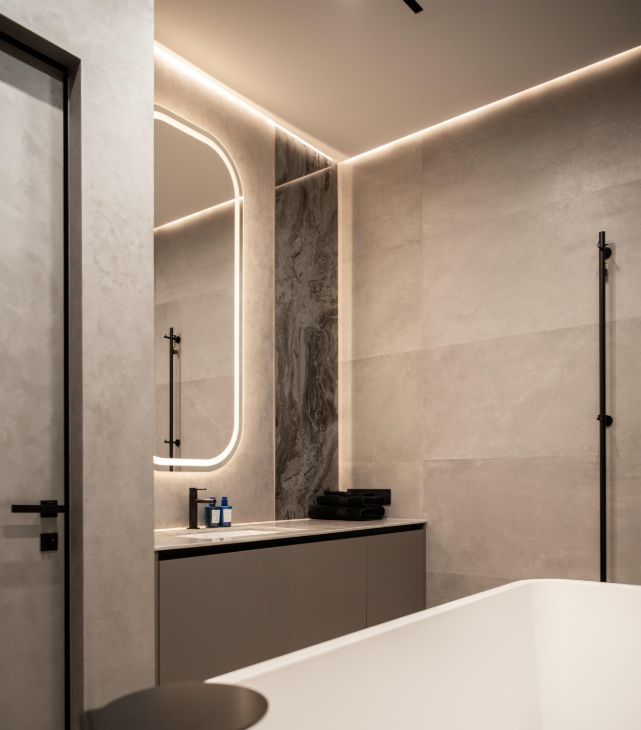 Интерьер оформлен в современном стиле, отделка осуществлена из качественных, премиальных материалов. Просторная гостиная с угловым остеклением.