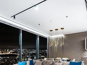 Панорамное остекление открывает захватывающие виды на столицу, наполняя пространство естественным светом и энергией.