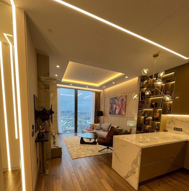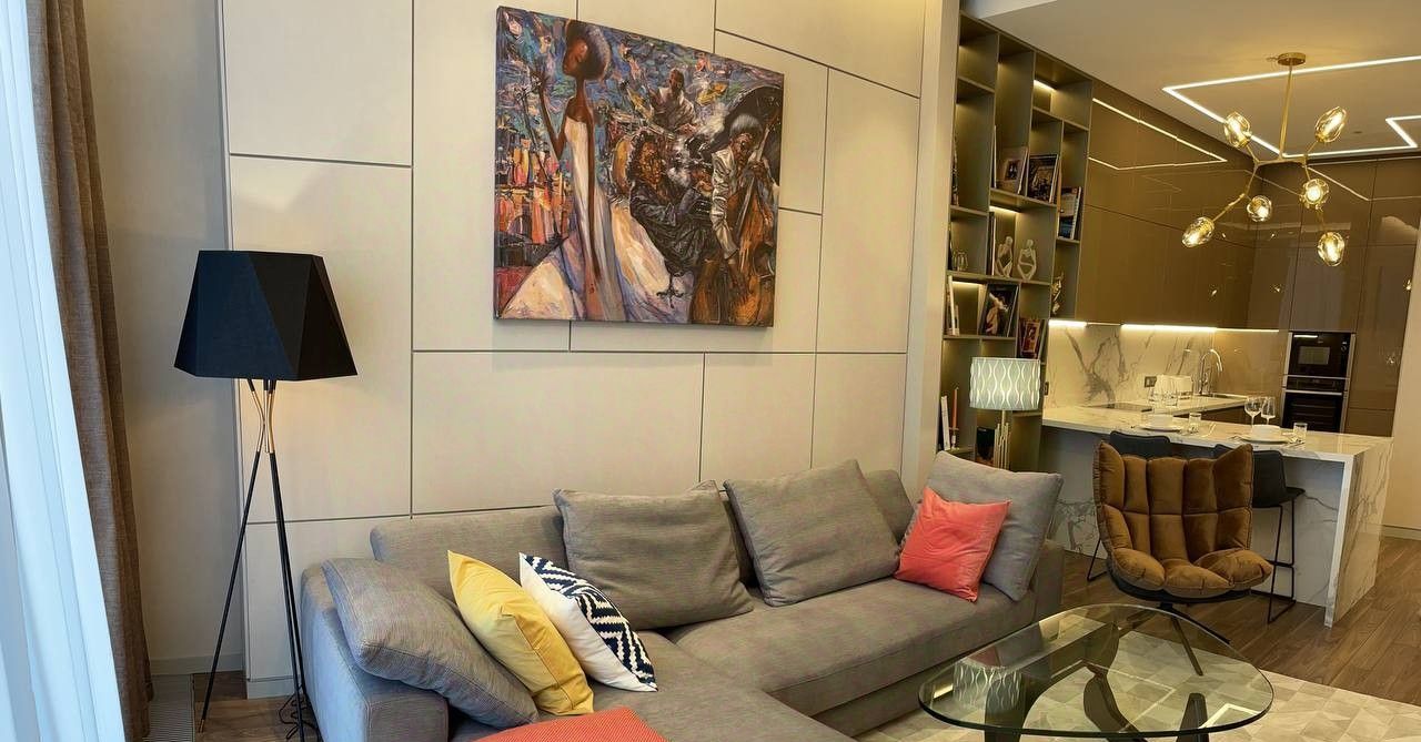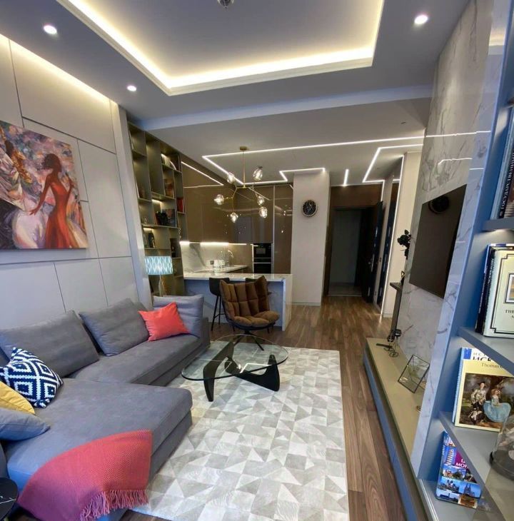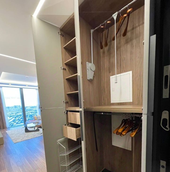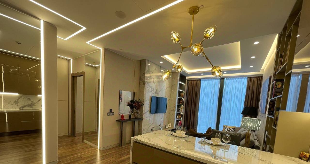 В апартаменте выполнена современная и стильная отделка. Функциональное планировочное решение: кухня-столовая, просторная гостиная, изолированная спальня, гардеробная, санузел. Апартамент полностью меблирован и оборудован всем необходимым для комфортного проживания: установлены кондиционеры, бойлер, посудомоечная, стиральная и сушильная машины, система сигнализации, подогрев пола. Панорамные окна с великолепными видами. Высокие потолки 3.6 м. Машино-место в подземном паркинге включено в стоимость.