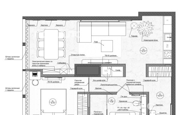 • В спальне — плотные шторы блэкаут, в гостиной — рулонные блэкаут-шторы.