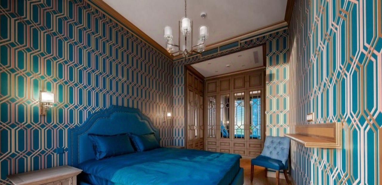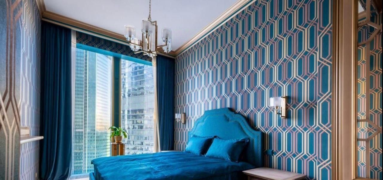 Спальня с дизайнерскими обоями и мягкой кроватью в изумрудных тонах,