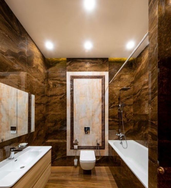 Стильная ванная комната с ванной и тропическим душем, а также стиральной машиной LG.