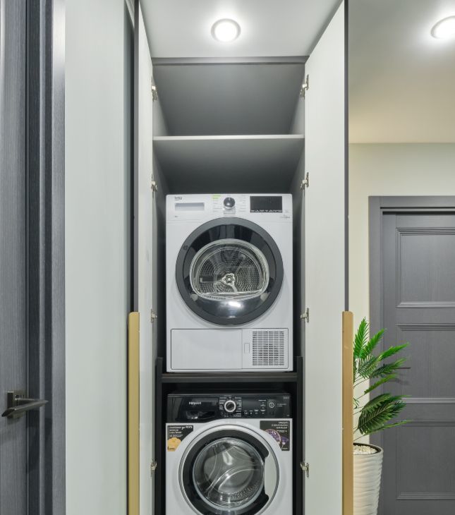 Есть посудомоечная машина, стиральная машина автомат и сушильная машина.