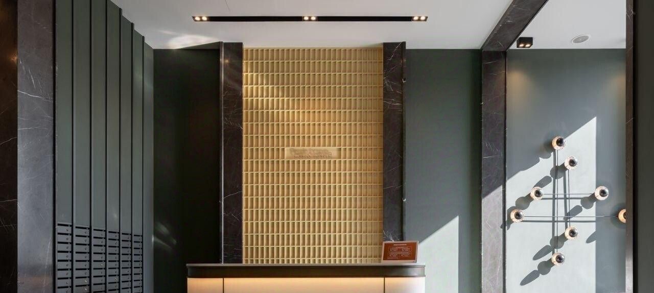 ЖК Hide имеет закрытую охраняемую территорию с собственной инфраструктурой на первых этажах - рестораны, пекарня, аптека, частная школа и т.д. Проход на закрытую территорию предусмотрен через отдельно стоящее здание с колоннадой - центральное гранд-лобби. В нем находится ресепшен, зона для получения онлайн-покупок и места для работы и отдыха - библиотека, лобби-бар и мягкая зона с биокамином.