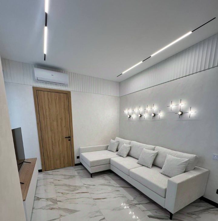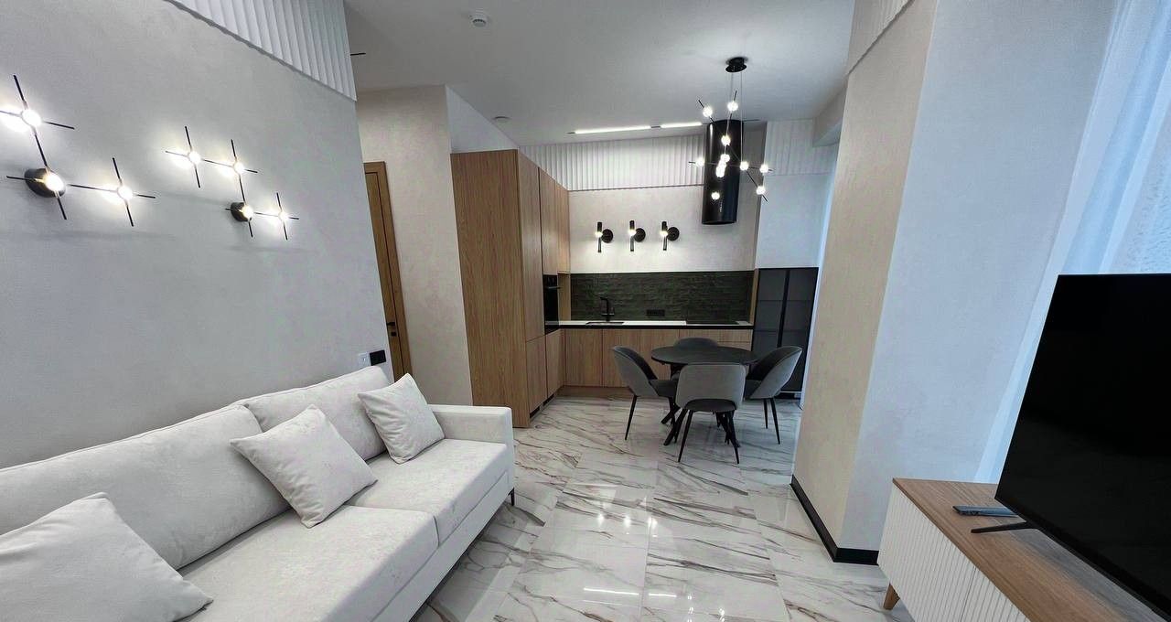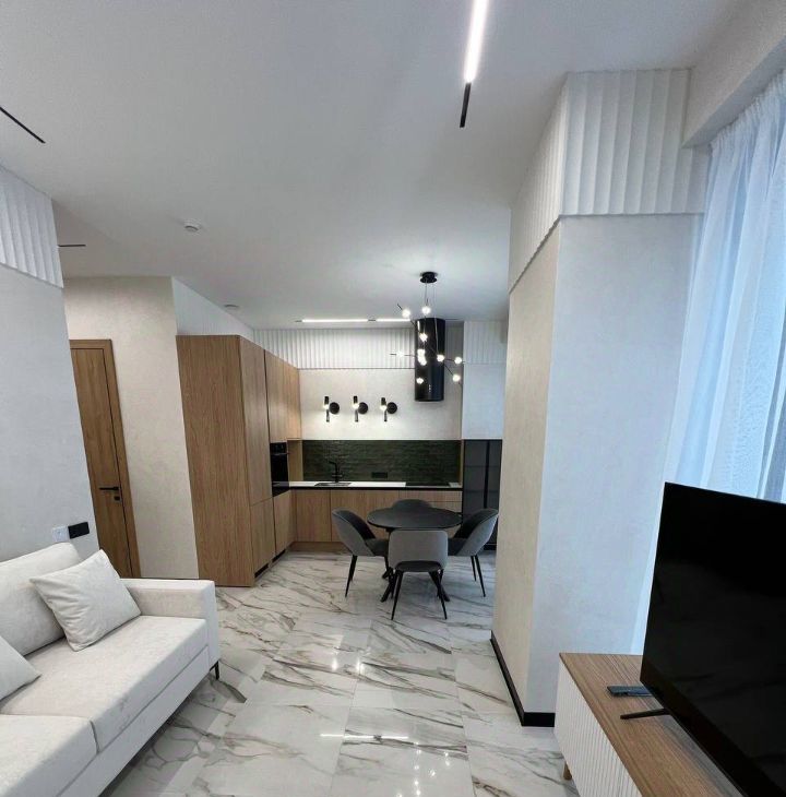 Просторная кухня-гостиная оборудованая современной мебелью и техникой: холодильник, телевизор, посудомоечная машина и кондиционер.