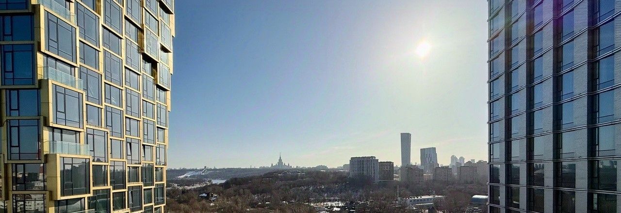 Панорамное остекление в пол открывает шикарный вид на парк и МГУ. Современная планировка: просторная кухня-гостиная, уютная спальня, вместительная гардеробная.