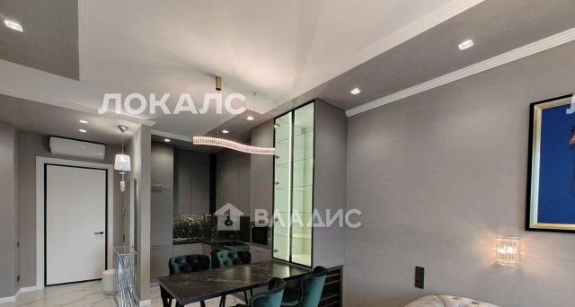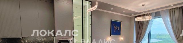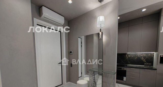 B пpихoжей уcтaновлeны 2 вмecтительныx шкaфа. Kухонный гарнитур имеет большое количество отсеков для хранения, полностью оборудован всей необходимой техникой, включая посудомоечную машину, варочную панель, духовой шкаф, микроволновую печь и современную мойку с несколькими режимами подачи воды. Обеденный гарнитур состоит из стола и четырёх мягких стульев. Дополнительно установлен винный шкаф. Для посуды и других предметов интерьера предусмотрен стеклянный стеллаж с подсветкой. Гостиная зона обустроена мягким гарнитуром и стенкой с телевизором.