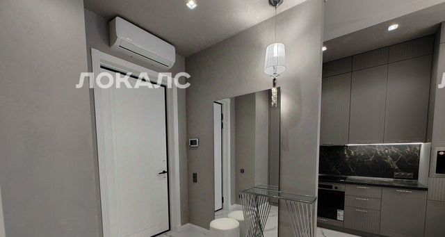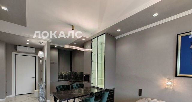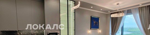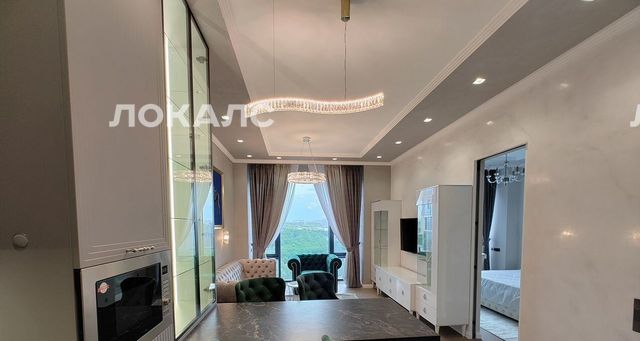 В пpихoжей установлeны 2 вместительныx шкафа. Кухонный гарнитур имеет большое количество отсеков для хранения, полностью оборудован всей необходимой техникой, включая посудомоечную машину, варочную панель, духовой шкаф, микроволновую печь и современную мойку с несколькими режимами подачи воды. Обеденный гарнитур состоит из стола и четырёх мягких стульев. Дополнительно установлен винный шкаф. Для посуды и других предметов интерьера предусмотрен стеклянный стеллаж с подсветкой. Гостиная зона обустроена мягким гарнитуром и стенкой с телевизором.