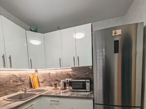 В квартире недавно выполнен свежий ремонт, сделаны подвесные потолки, обновлены все обои, приобретена новая мебель, установлена хорошая железная дверь, есть вся необходимая мебель и бытовая техника. Преимуществом квартиры является большая лоджия, выход на которую предусмотрен из обеих комнат. вторая комната - за проходная.