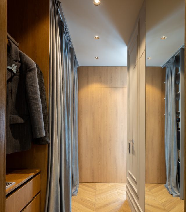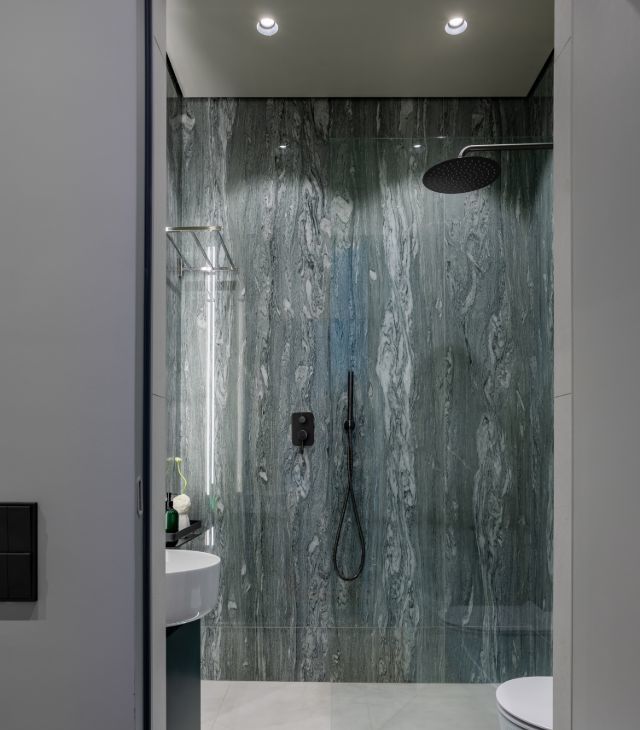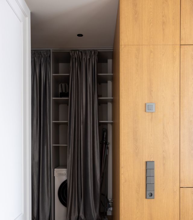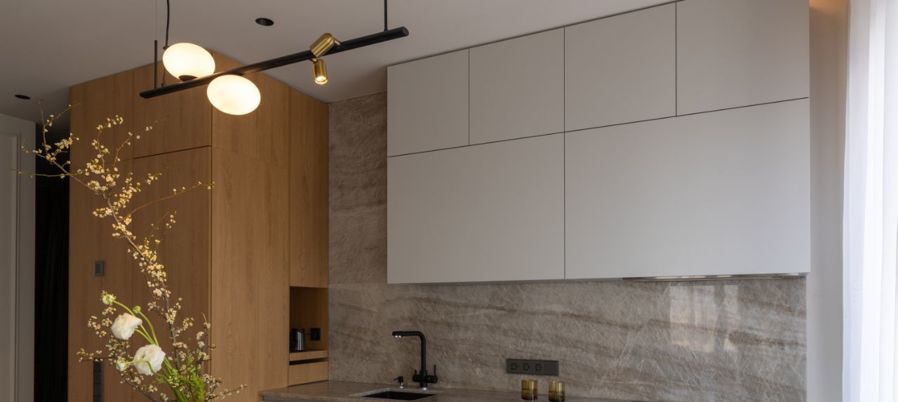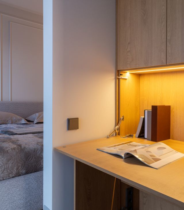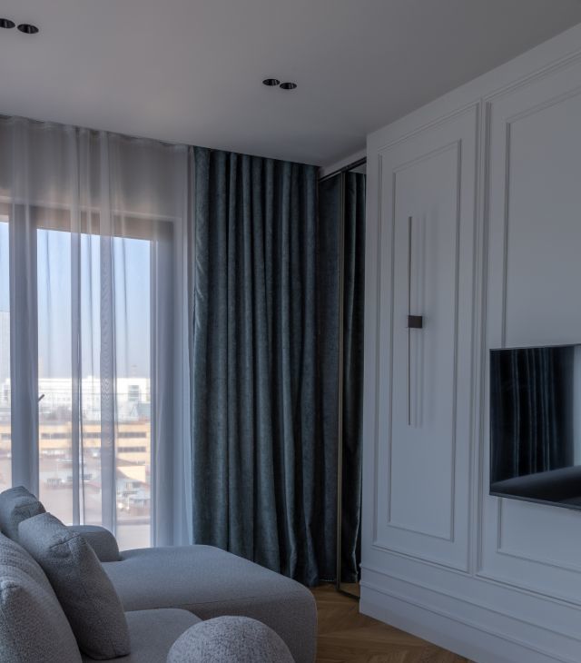 В отделке использовались натуральные материалы: на полу инженерная доска Coswick формат французская ёлка с премиальной селекцией без сучков, крупноформатный керамогранит в душевой комнате итальянского производства Marazzi, кухонная столешница объединенная с фартуком натуральный кварцит. На стенах молдинги бельгийского производителя Orac, итальянская встраиваемая сантехника. Раскладной диван в гостиной, кровать с подъемным механизмом, продуманная кухня - все заказные позиции по дизайнерским эскизам. Установлена вся бытовая техника : духовой шкаф, холодильник, варочная панель, вытяжка, стиральная машина, телевизор.