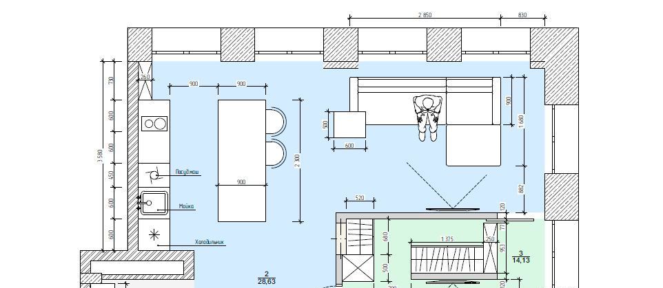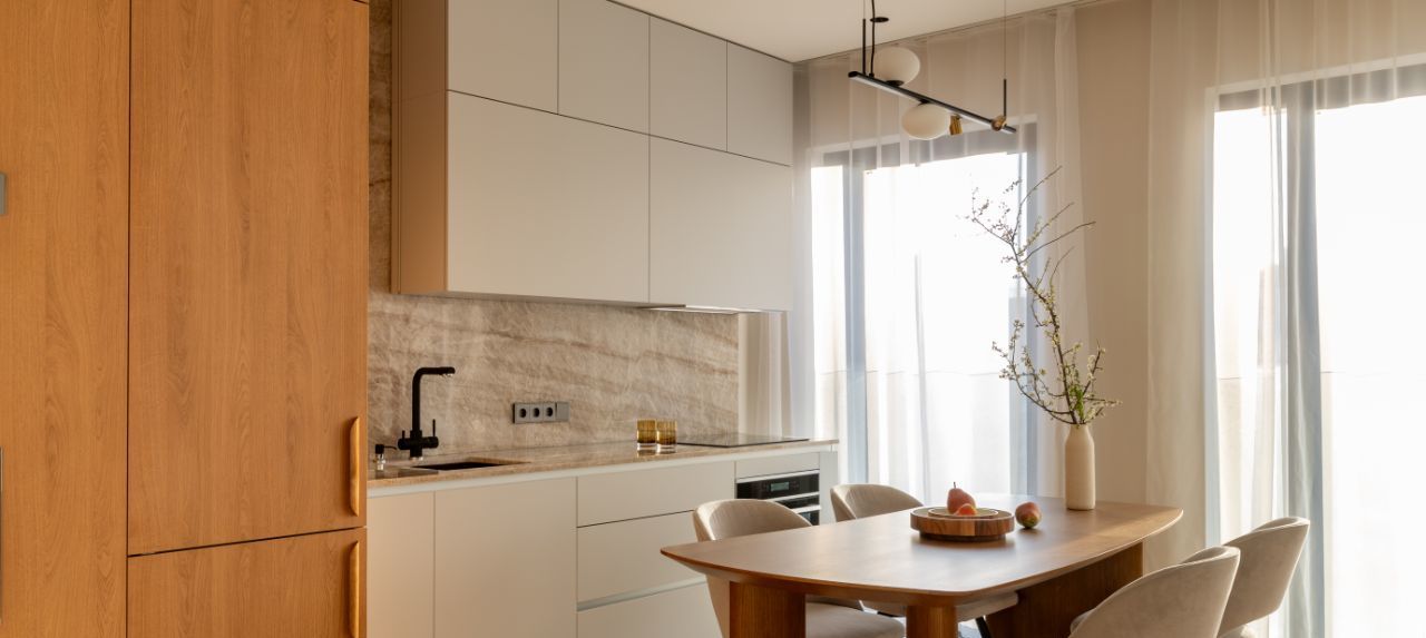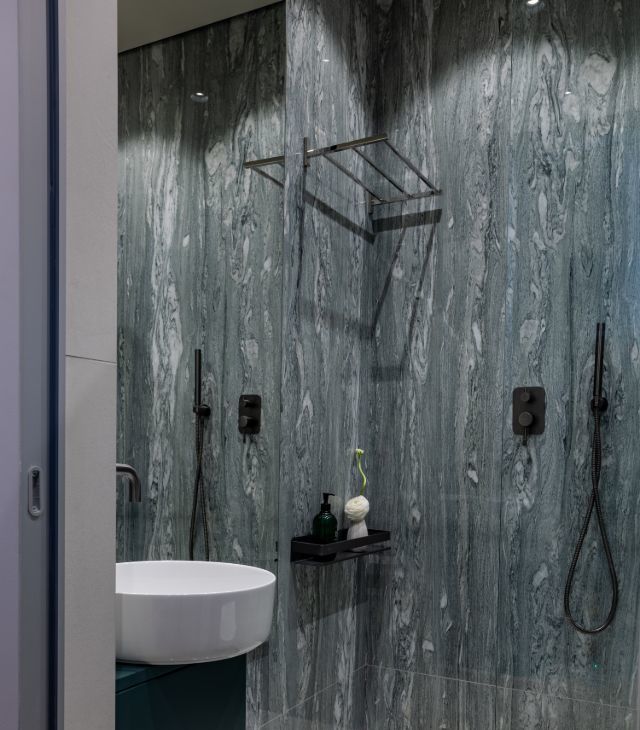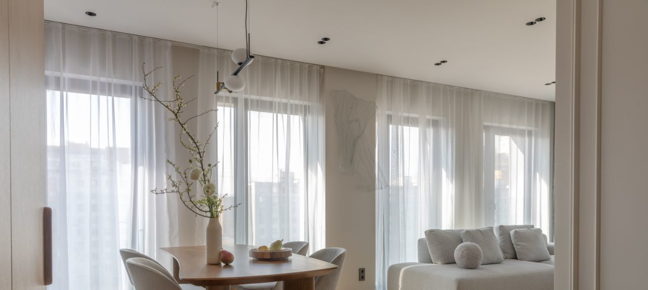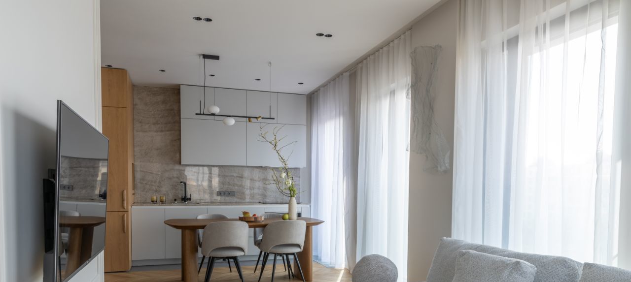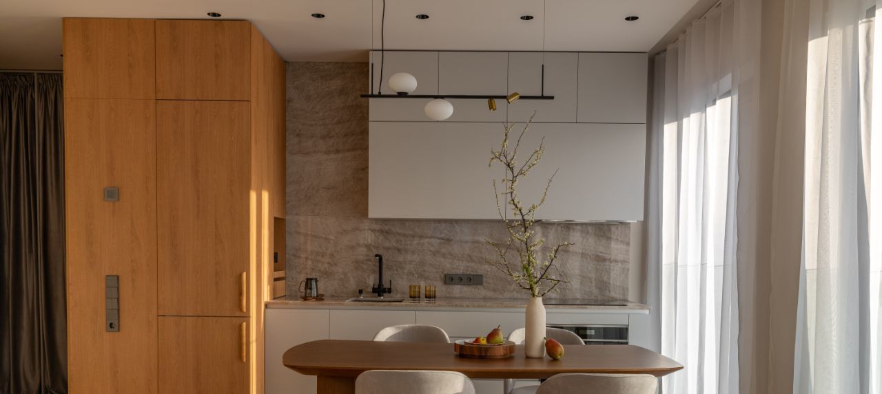 В отделке использовались натуральные материалы: на полу инженерная доска Coswick формат французская ёлка с премиальной селекцией без сучков, крупноформатный керамогранит в душевой комнате итальянского производства Marazzi, кухонная столешница объединенная с фартуком натуральный кварцит. На стенах молдинги бельгийского производителя Orac, итальянская встраиваемая сантехника. Раскладной диван в гостиной, кровать с подъемным механизмом, продуманная кухня - все заказные позиции по дизайнерским эскизам. Установлена вся бытовая техника : духовой шкаф, холодильник, варочная панель, вытяжка, стиральная машина, телевизор.