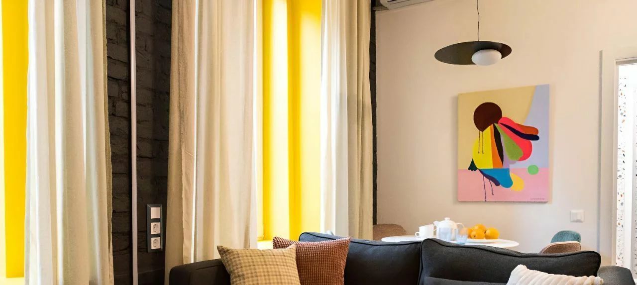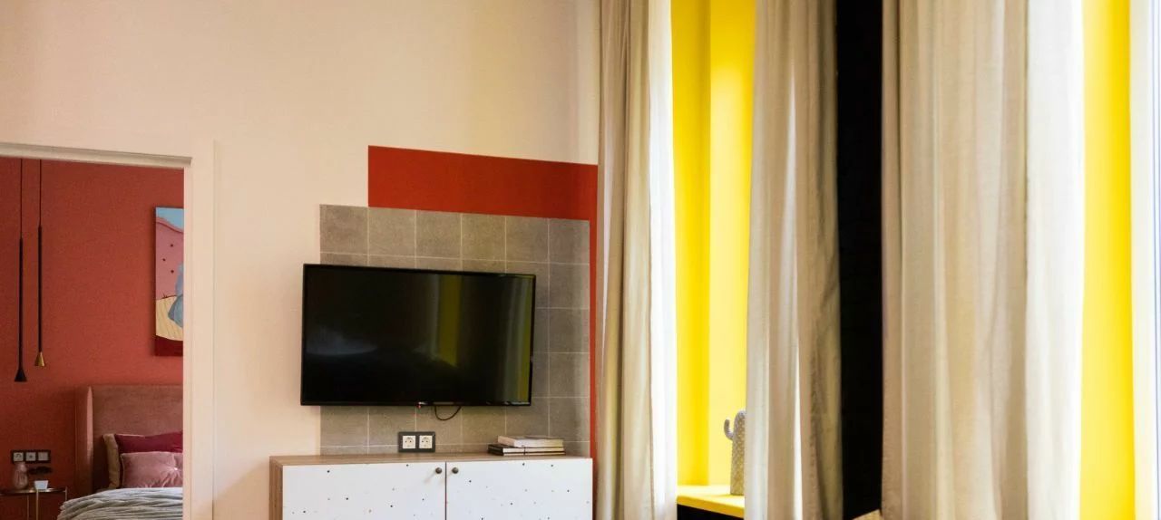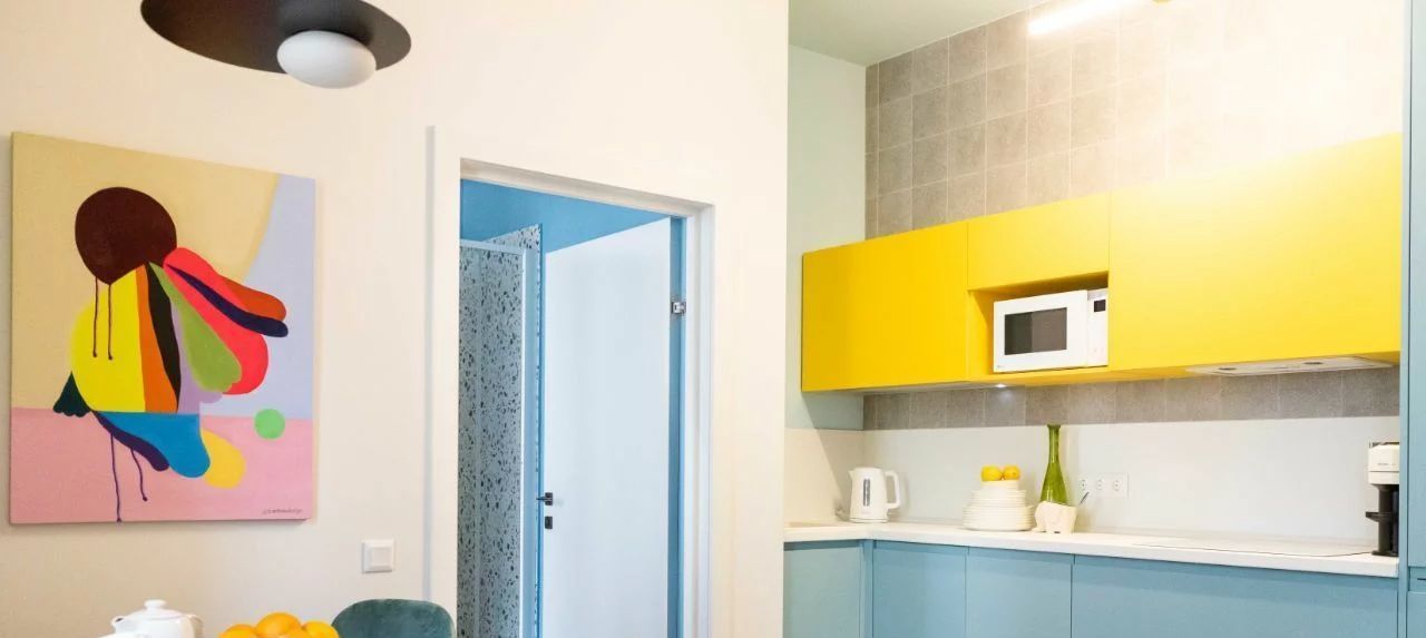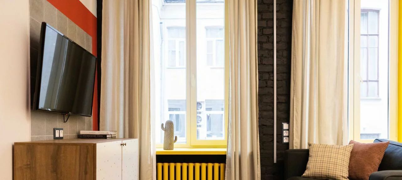 Планировка представляет собой просторную кухню-гостиную, отдельную спальню, совмещенный с/у. В квартире есть всё для комфортного проживания: кровать, кофемашина, стиральная машина, кондиционер. Четыре высоких окна делают пространство светлым и просторным.