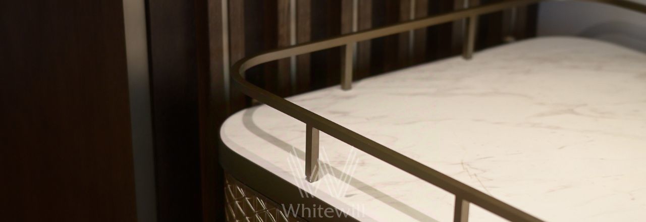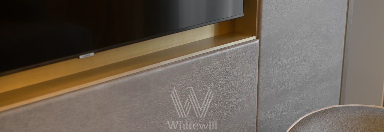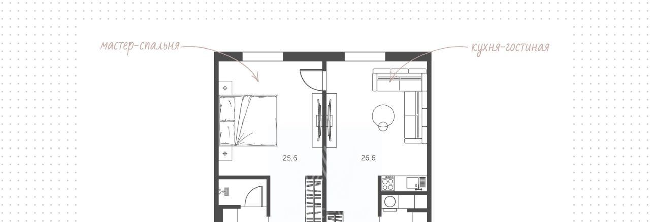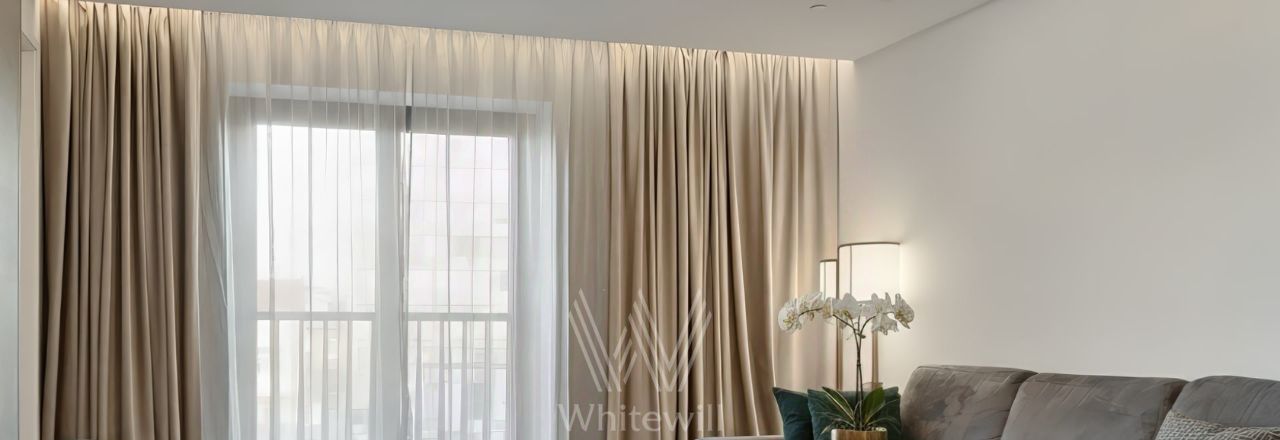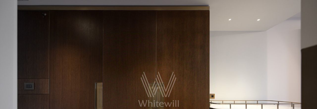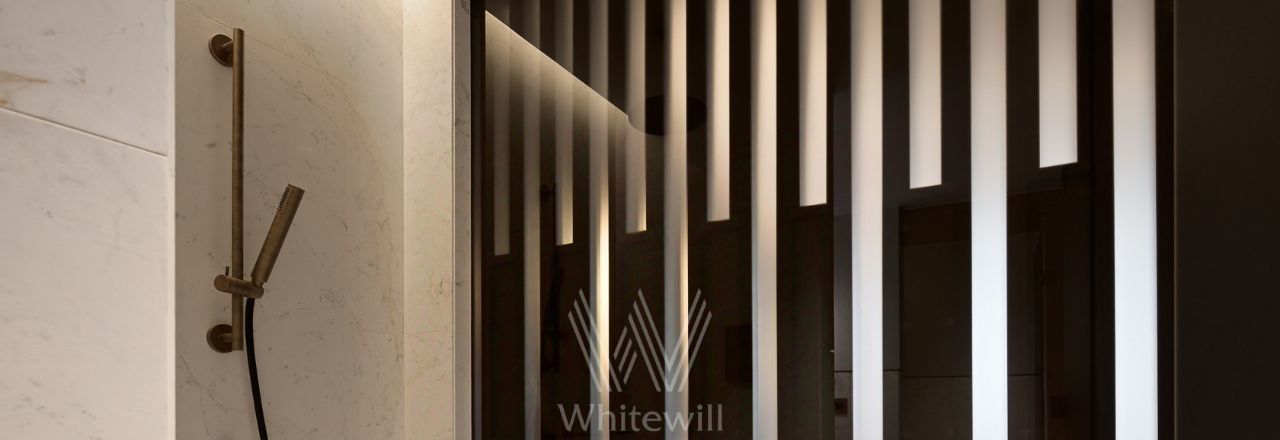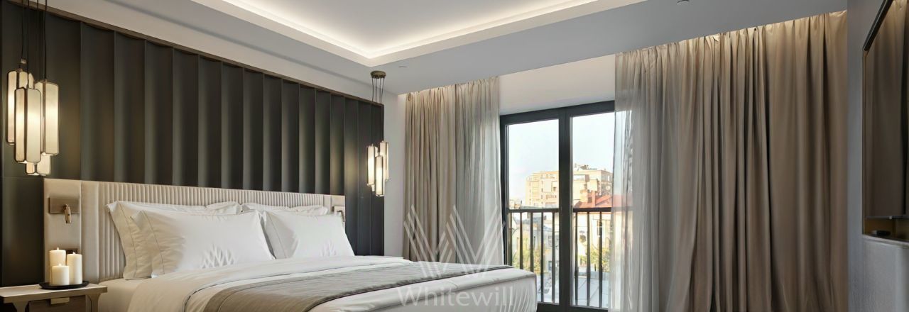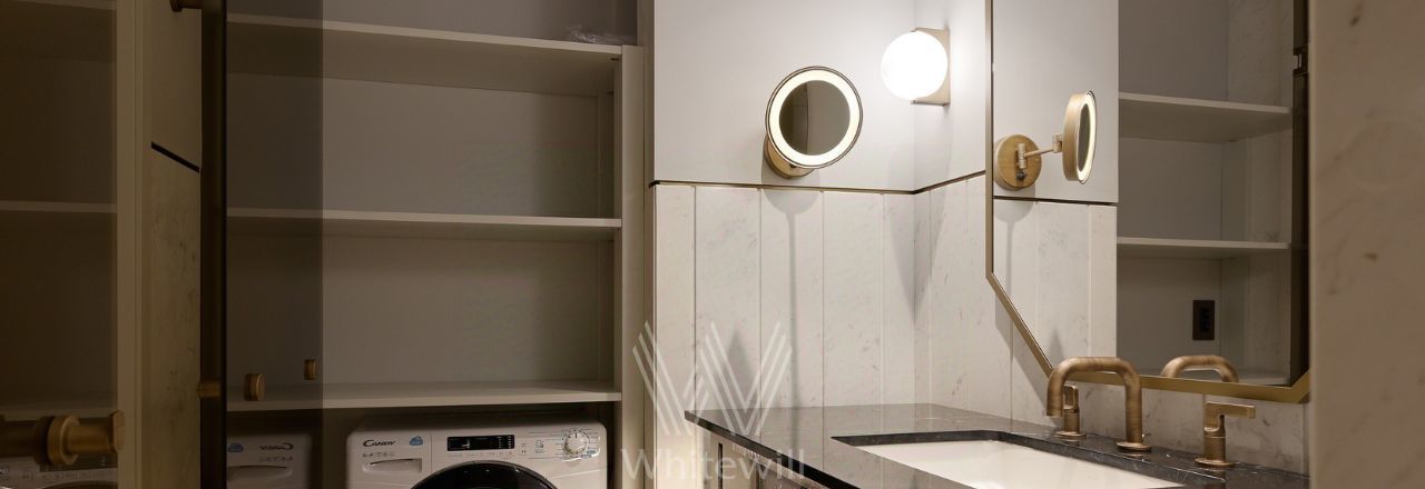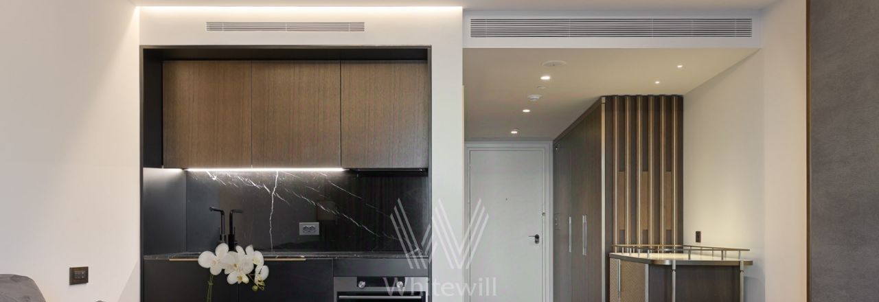 В апартаментах роль дворецкого играет умный дом: он заранее включит кондиционер и вскипятит чайник. Атмосфера — ретро-шик: строгая геометрия сочетается с плавными контурами и мягкими фактурами. Палитра: графит и беж с латунными акцентами, мрамор и ценные породы дерева.