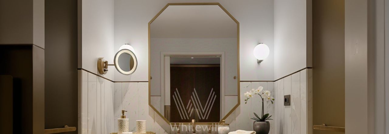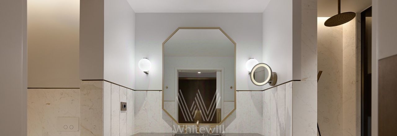 Гостиная располагает к вечеру с коктейлями в богемной компании. Кухня прячется за матовыми фасадами, не нарушая собранности пространства. Спальня напоминает о шике немого кино. Ванная в мраморе и латуни — как гримёрная эпохи ар-деко. Вы словно звезда старого Голливуда. Только вместо софитов — огни Тверской.