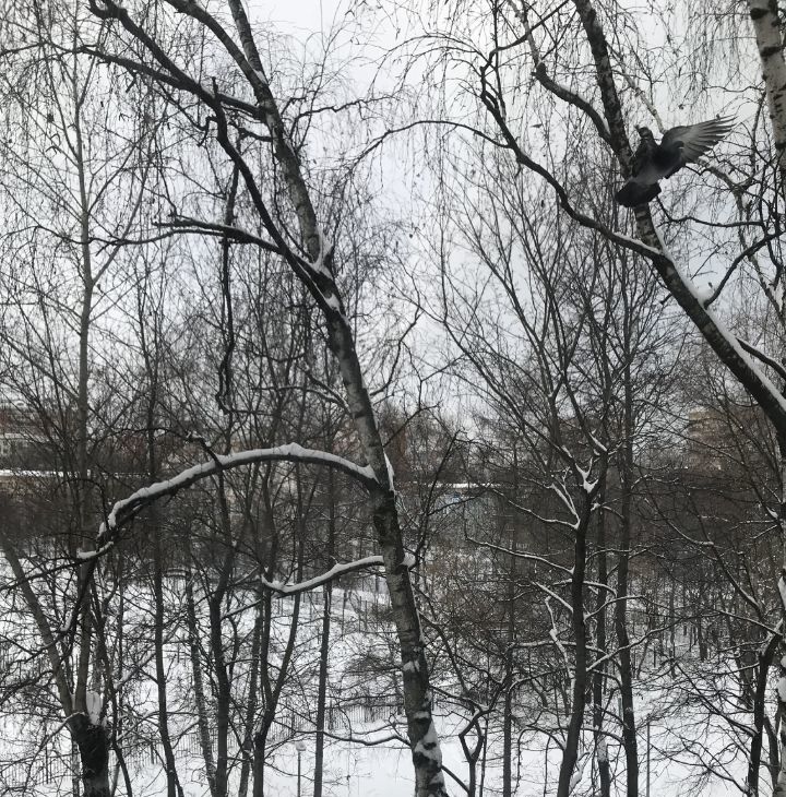 Красивый вид из окон во двор на высокие деревья. Светлая сторона.