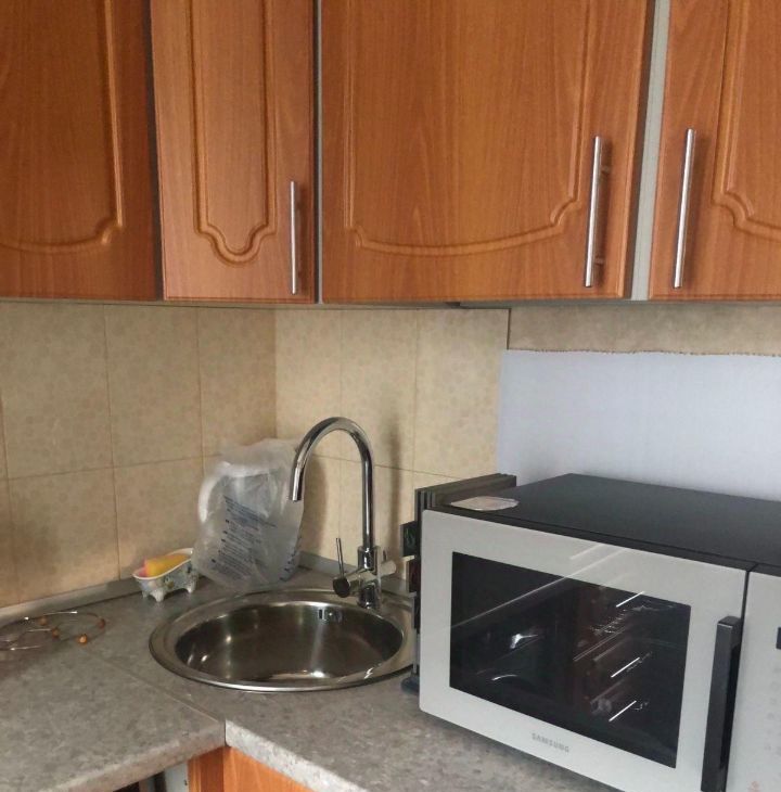 кухонный гарнитур, холодильник, микроволновая печь, чайник.